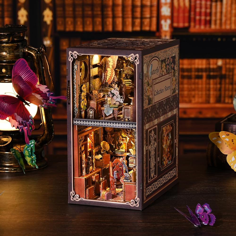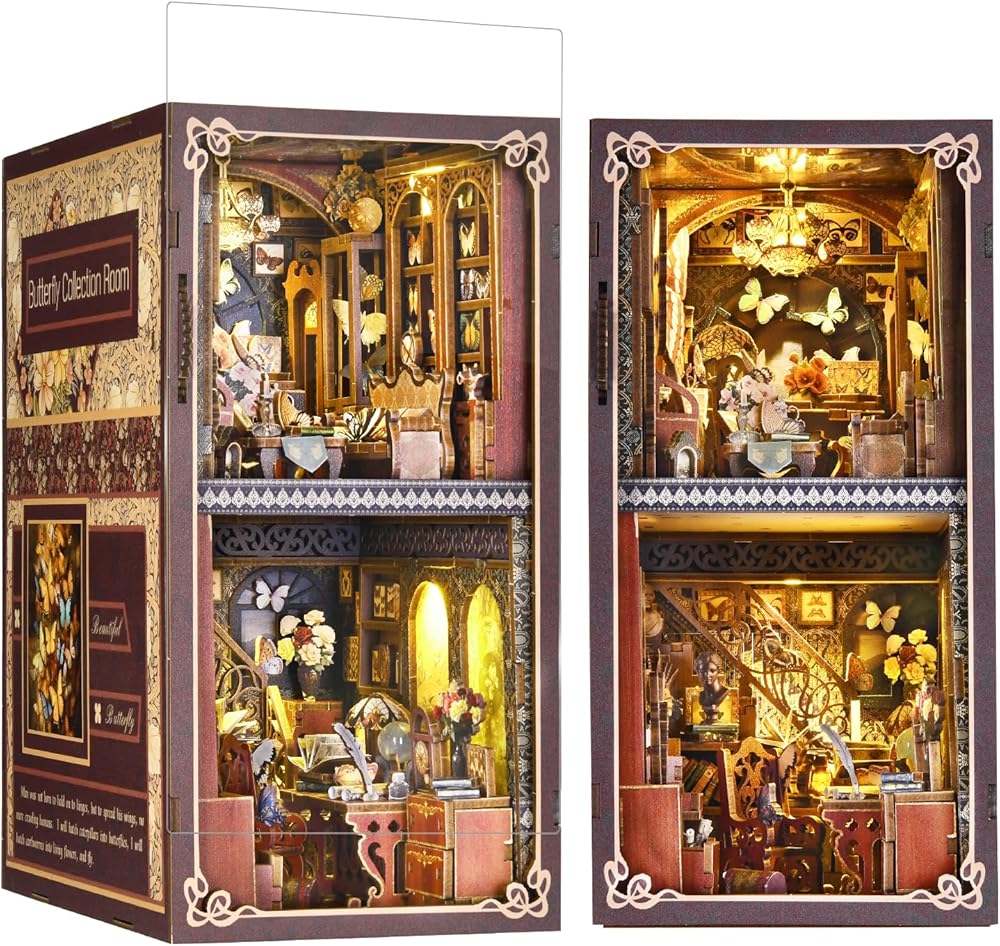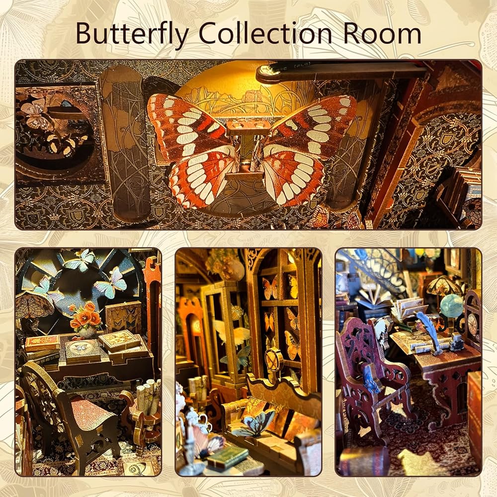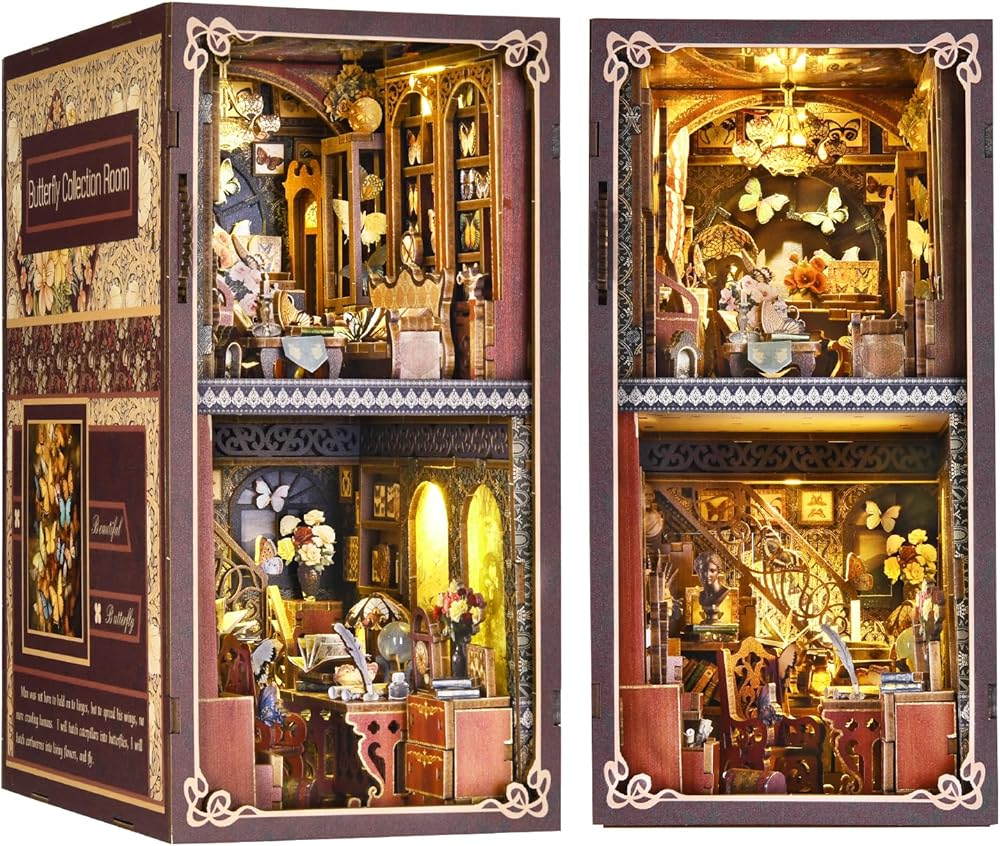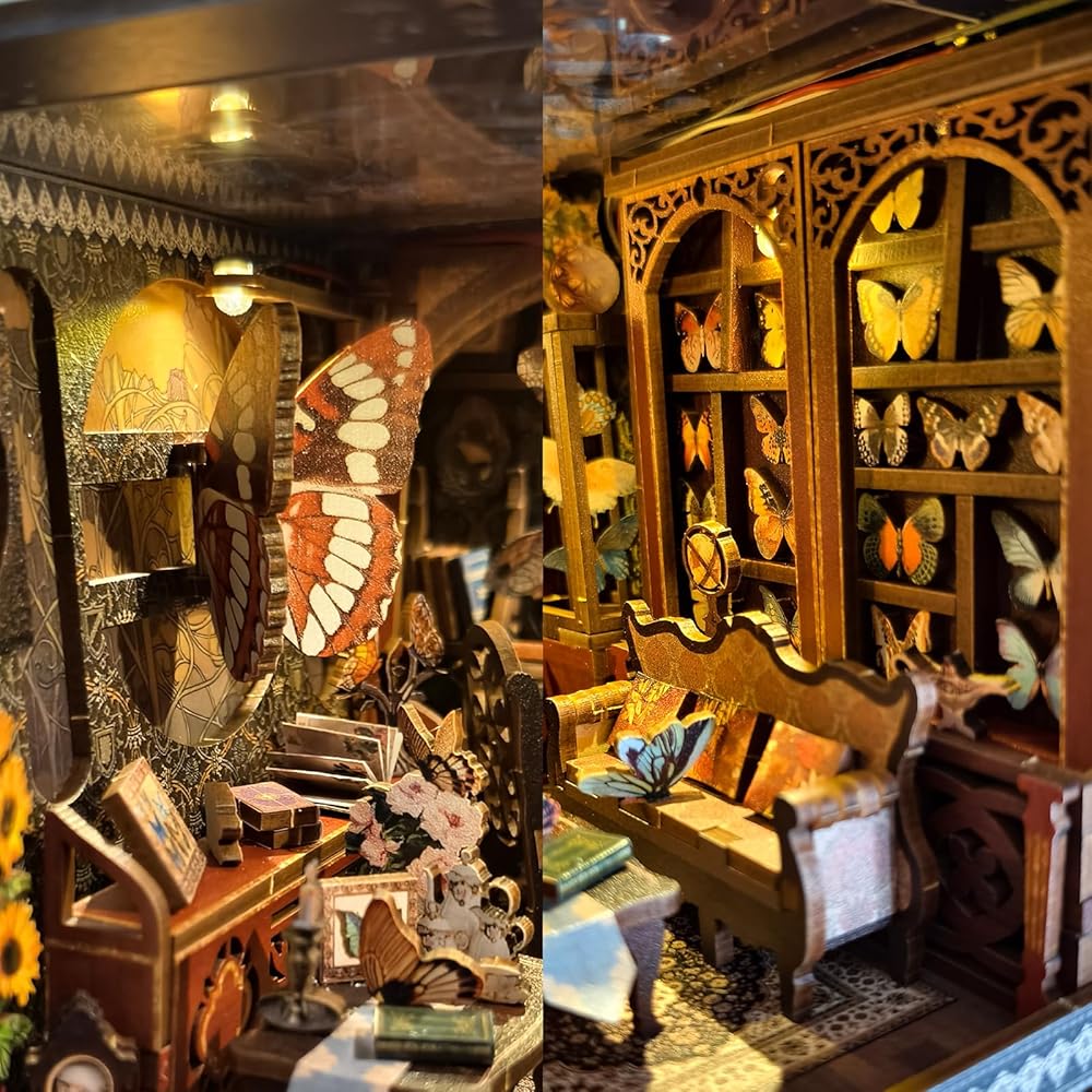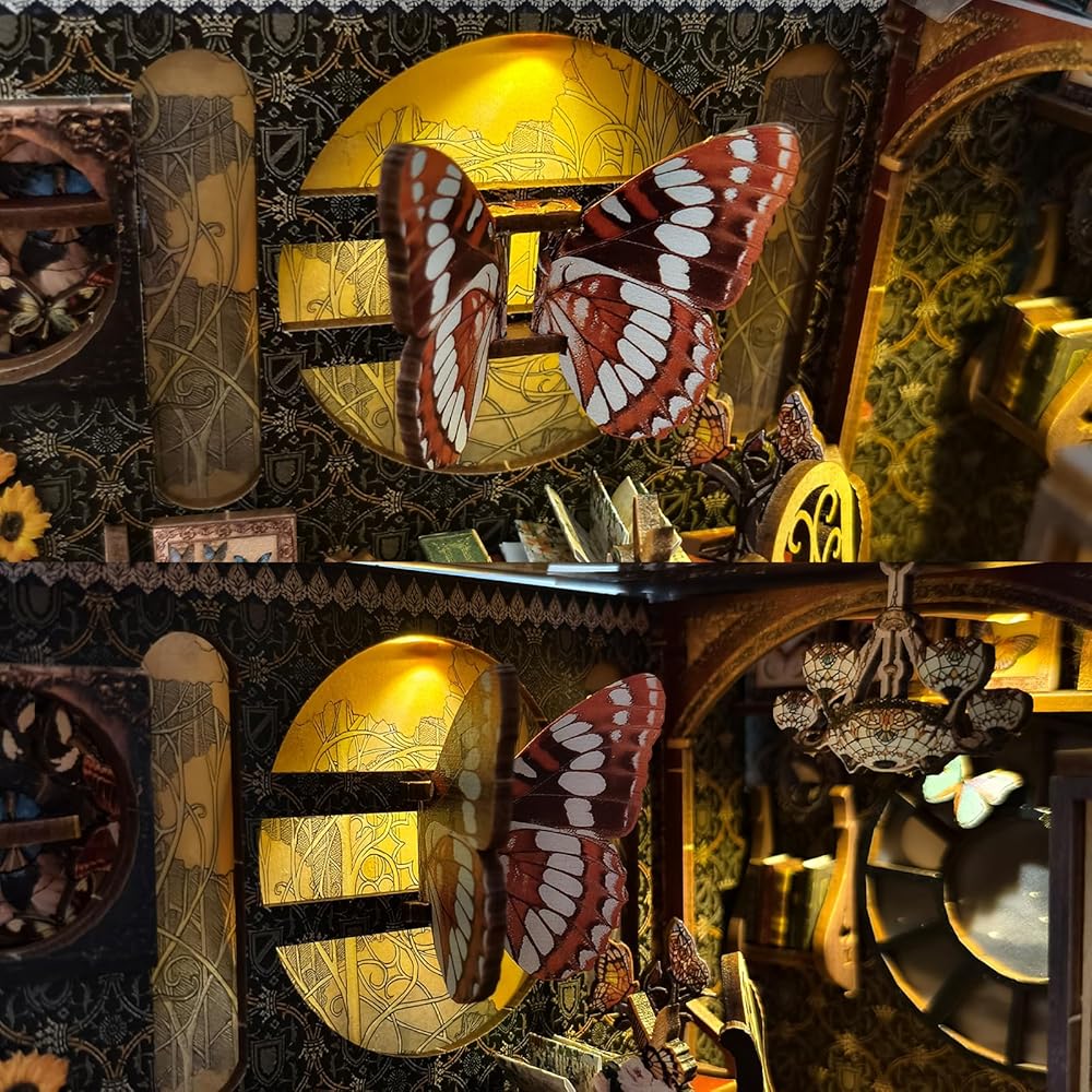 【ديكور رف الكتب】ليس ملحق رف زاوية الكتب مجرد مشروع زاوية للكتب بنفسك، ولكنه أيضًا مجموعة وديكور رائع. تحتوي على مجموعة مصابيح LED. بعد تجميع مجموعة بيت الدمى الصغيرة المكتملة ذات الأضواء المفتوحة، يضيء عالم الفراشة. الفراشة الكبيرة ذات الأجنحة المتحركة وألبوم الفراشة الدوار تجعل مجموعة زوايا الكتاب أكثر مرحًا وجاذبية. يمكنه تزيين سطح المكتب ورف الكتب والغرفة.