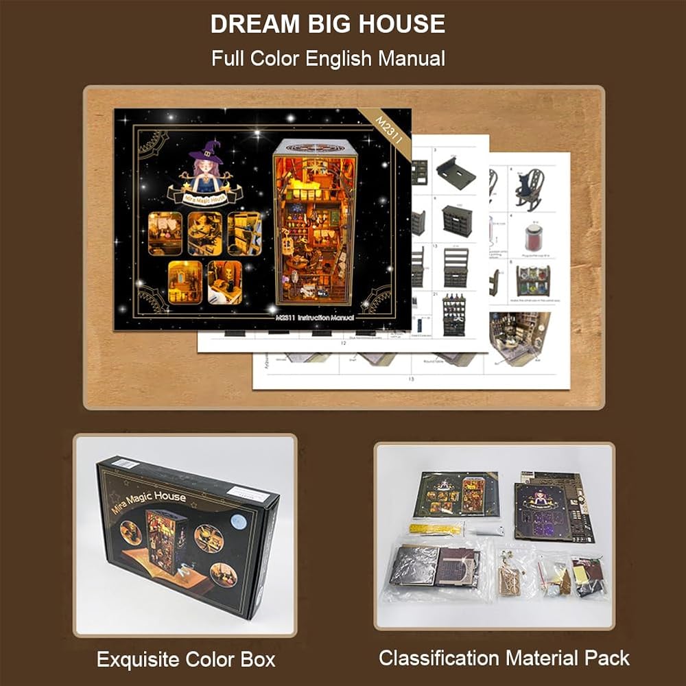 جميع المنتجات ذات جودة عالية ومواد آمنة، يرجى الاطمئنان عند الاستخدام، حيث يتم قطع الأثاث والقطع الخشبية الأخرى بدقة لضمان تجميعها بشكل صحيح. مصابيح LED والنباتات والديكورات والأثاث كلها واقعية للغاية ومصممة بذكاء. مجموعة إدخال رف الكتب DIY مناسبة للأشخاص الذين تزيد أعمارهم عن 14 عامًا.