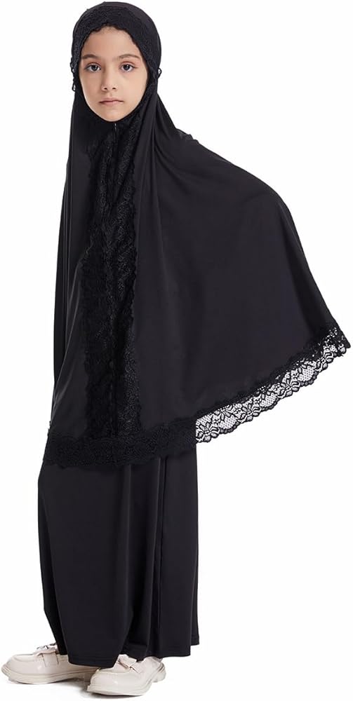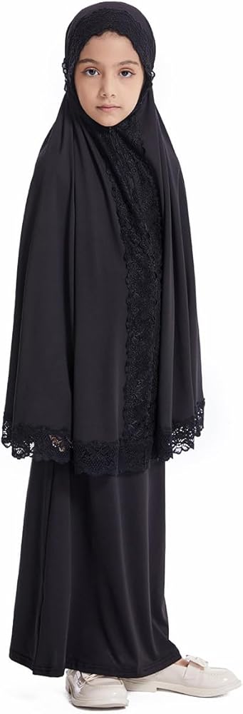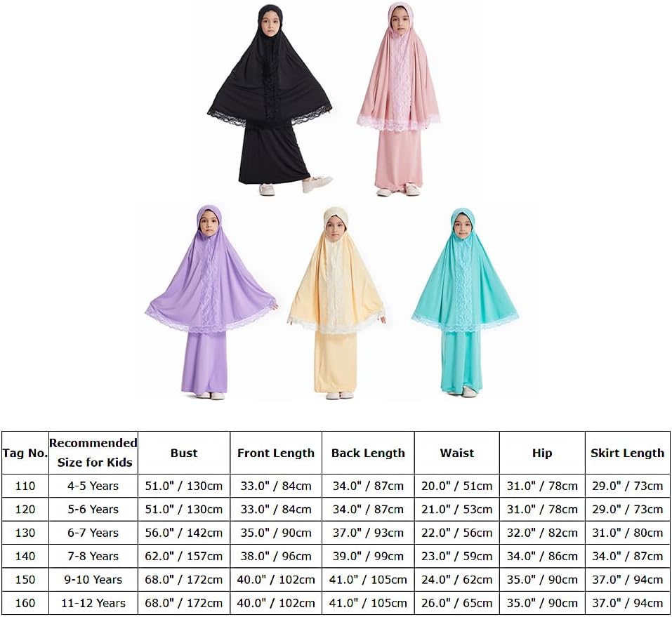 Kids Girls Middle East Lace Trim Hijab Dress Abaya and Loose Skirt Full Cover Kaftan Arabic 2 Pieces Sets