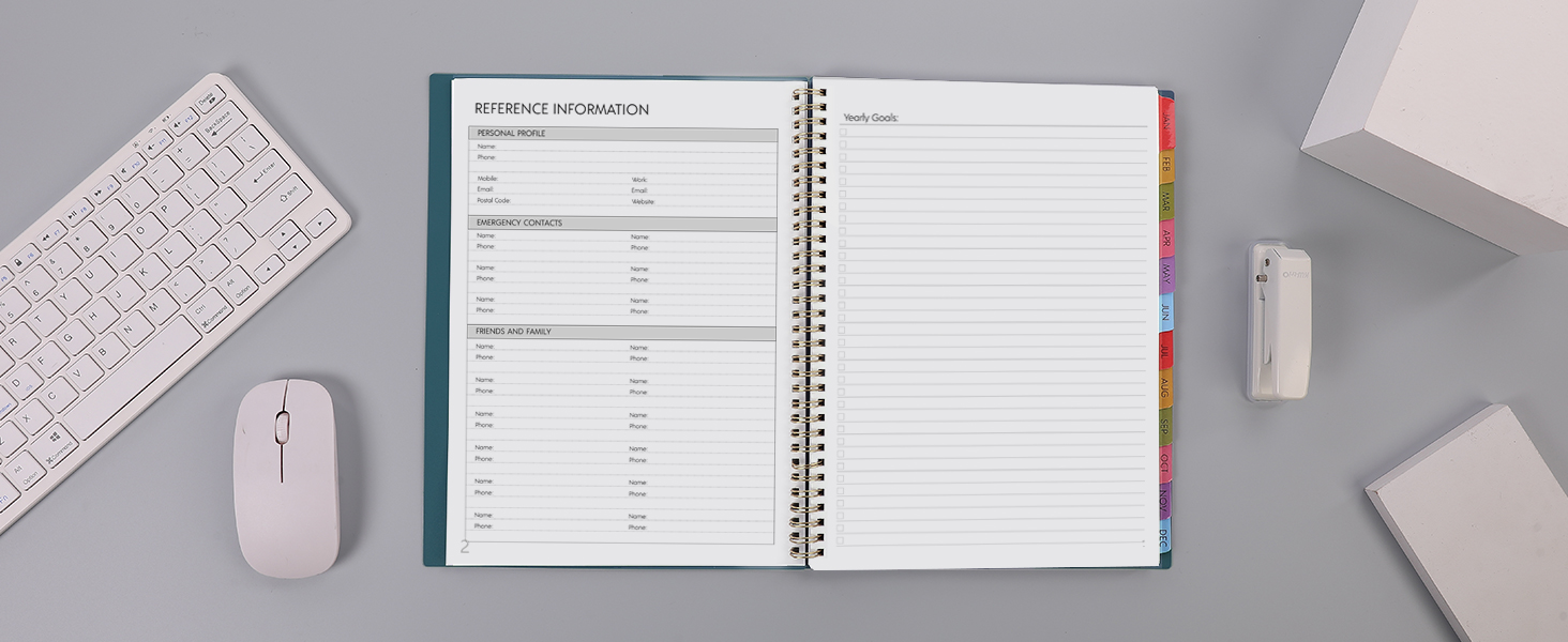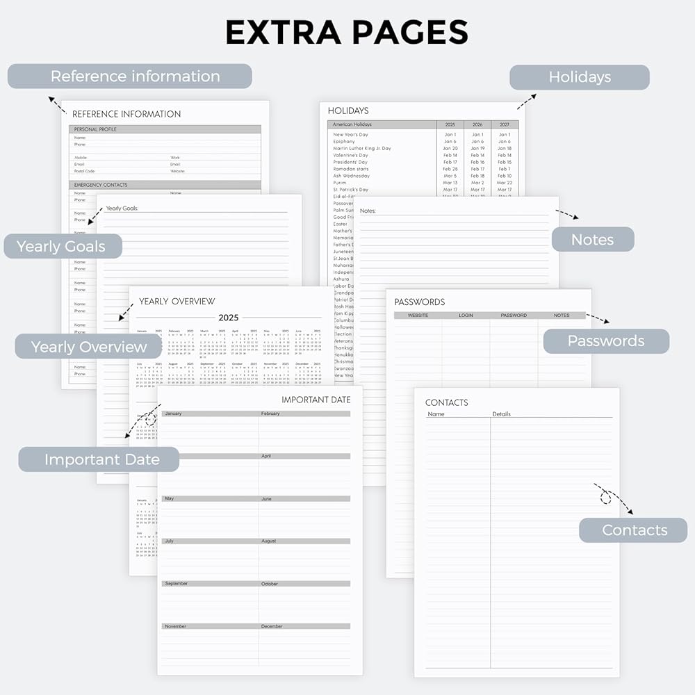 صفحات إضافية: تتضمن صفحات إضافية لتحديد الأهداف السنوية، وتقويم نظرة عامة لمدة ثلاث سنوات، وتواريخ مهمة، وجهات اتصال مرجعية سريعة، وتتبع كلمات المرور، وملخص العطلات، و10 صفحات ملاحظات إضافية