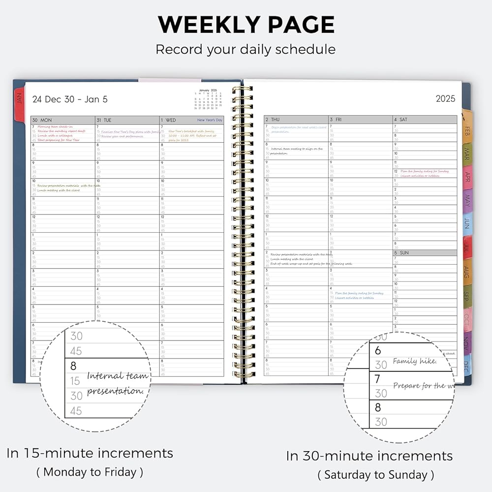 العروض الأسبوعية واليومية: يقدم المخطط تخطيطًا أسبوعيًا من صفحتين مع مساحة جدولة يومية من 7 صباحًا إلى 8 مساءً. يتم تقسيم أيام الأسبوع إلى زيادات مدتها 15 دقيقة، بينما تستخدم عطلات نهاية الأسبوع زيادات مدتها 30 دقيقة. نظرة عامة شهرية متكاملة تسلط الضوء على الأسبوع الحالي، ويوفر الحجم الواسع مقاس 8.5 × 11 بوصة مساحة واسعة لجميع ملاحظاتك