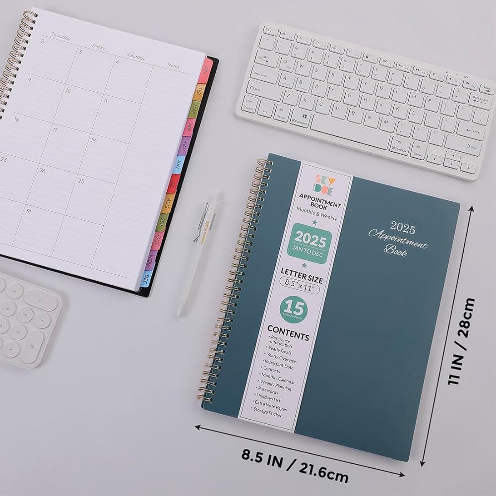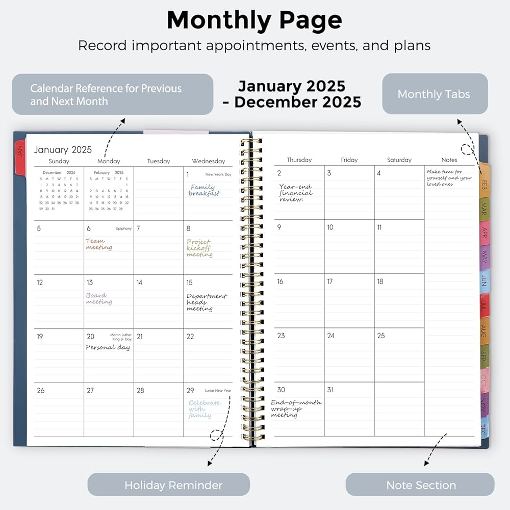 كتاب مواعيد 2025: يغطي العام بأكمله من يناير إلى ديسمبر 2025، يتضمن هذا المخطط تقويمًا شهريًا مع العطلات لتسهيل تتبع الأحداث المهمة. يتم وضع علامة قوس قزح على كل شهر بشكل ملائم للتنقل السريع
