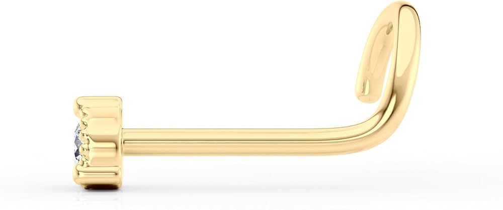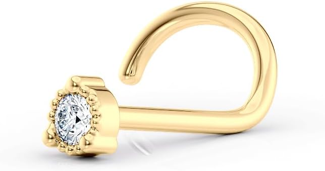 SECURE AND STYLISH - Transform your look with this 20 Gauge curved screw nose stud, crafted from 14k yellow gold and adorned with a brilliant Cubic Zirconia. This unisex nose ring combines luxury and practicality, featuring a curved screw design for a secure and comfortable fit, perfect for both everyday wear and special occasions. Whether enhancing your daily style or adding a touch of elegance to your evening attire, this versatile nostril piercing jewelry is designed to shine and endure
