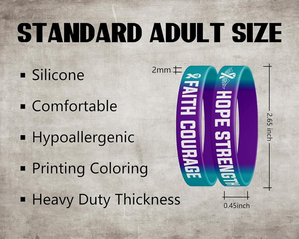 1. One Size: each silicone wristband measures approx. 8 x 0.5 inch, it can be stretched to fit different hands, one size fits most adults, teens.The bracelets to help raise awareness of Suicide Prevention Awareness and share words of encouragement, Give people hope, Wristbands in Teal and Purple to Support Your Loved One Struggling with Suicidal Thoughts