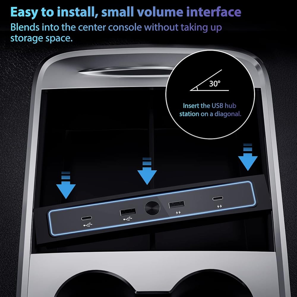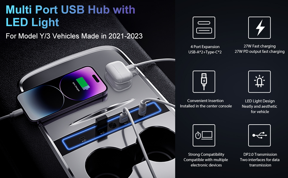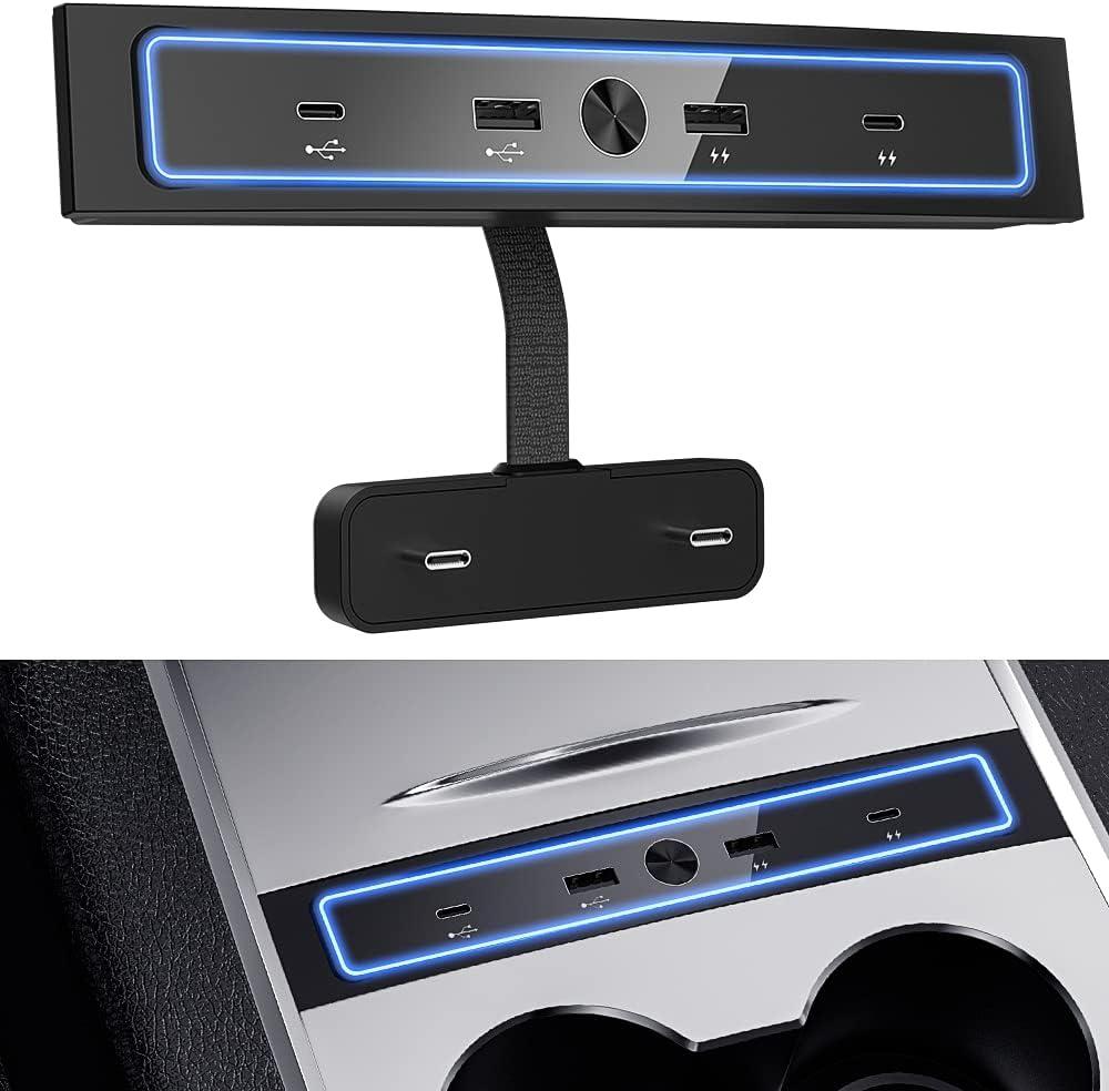 موزع USB متعدد الأغراض: يوفر شاحن USB للسيارة هذا للطراز 3/Y 2021-2023 إمكانات الشحن ونقل البيانات القياسية. توافق قوي مع الهواتف الذكية، وأجهزة iPad، ولوحة الألعاب، والكاميرا الرقمية، والقرص الصلب المحمول، وقراءة الموسيقى وقرص U-Disk إلخ.