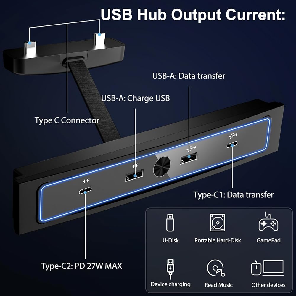 منافذ متعددة 4 في 1: تتميز بتوسيع 4 منافذ. 2 × منفذ من النوع C: يدعم الشحن السريع ونقل البيانات بقدرة 27 وات؛ 2 × منفذ USB 2.0: يدعم شحن USB ونقل البيانات. باستخدام منفذ الشحن السريع، لن تقلق بعد الآن بشأن سرعة الشحن البطيئة