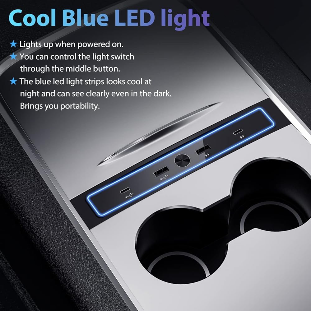 شاحن سيارة USB مطور للطراز 3/Y 2021-2023، محطة إرساء محور USB متعددة المنافذ 4 في 1 مع ضوء LED أزرق لمحول وحدة التحكم المركزية، ملحقات الطراز 3/Y مع شحن PD بقوة 27 وات