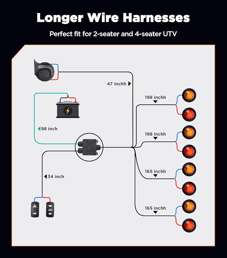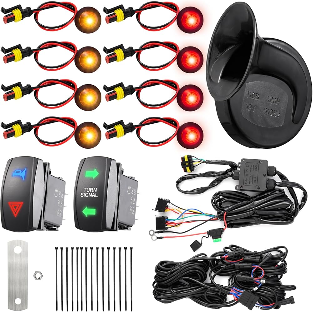 • أضواء أكثر سطوعًا وقرن أعلى: تتميز مجموعة إشارة الانعطاف UTV بإضاءة إشارة الانعطاف LED المزدوجة المطورة (مصابيح LED الكهرمانية والحمراء، 8 مصابيح LED في المجموع)، مما يوفر اختراقًا ورؤية أقوى لإشارات الانعطاف وأضواء الخطر، مما يجعل سيارتك أكثر وضوحًا وأمانًا . يقوم البوق العالمي 110 ديسيبل 510 هرتز بتنبيه المشاة والمركبات والحيوانات بشكل فعال أثناء القيادة
