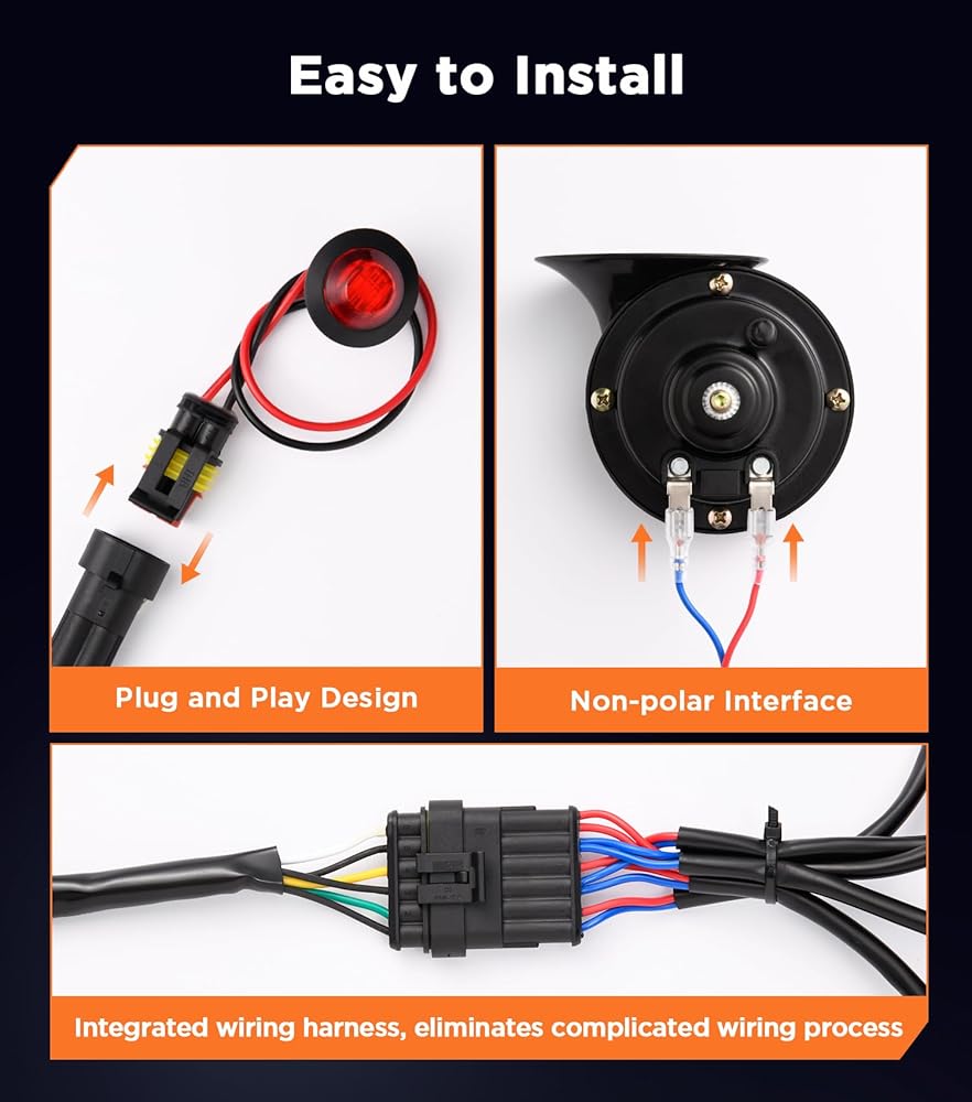 • سهولة التركيب والاستخدام: يعمل حزام الأسلاك المتكامل للتوصيل والتشغيل على التخلص من عملية الأسلاك المعقدة، مما يسمح بالأسلاك والتركيب البسيط. يتيح لك تصميم الزر المرن تفعيل البوق بضغطة قصيرة أو طويلة، ويتوقف فورًا عند تحريره. يتم أيضًا إضاءة مفتاح Rocker Switch لسهولة وضعه في الظلام، مما يضمن التشغيل السلس في الليل