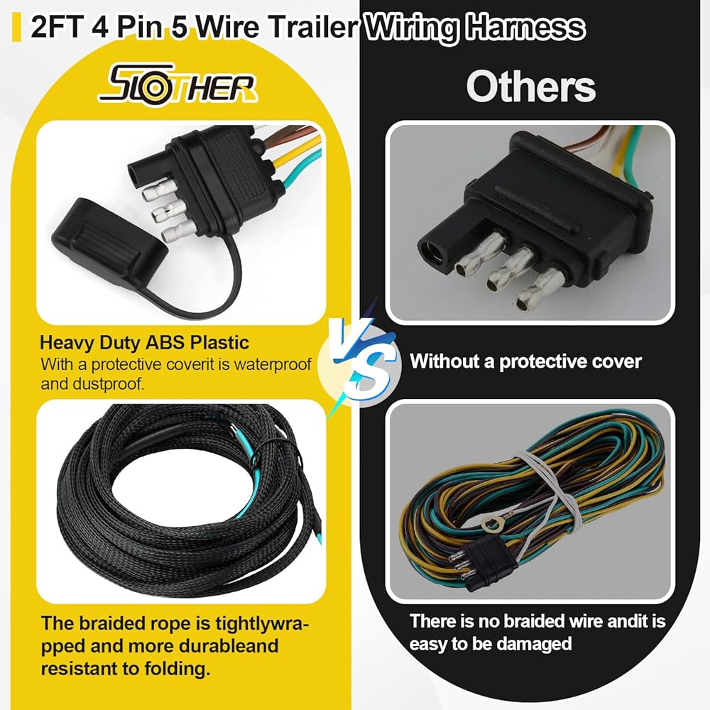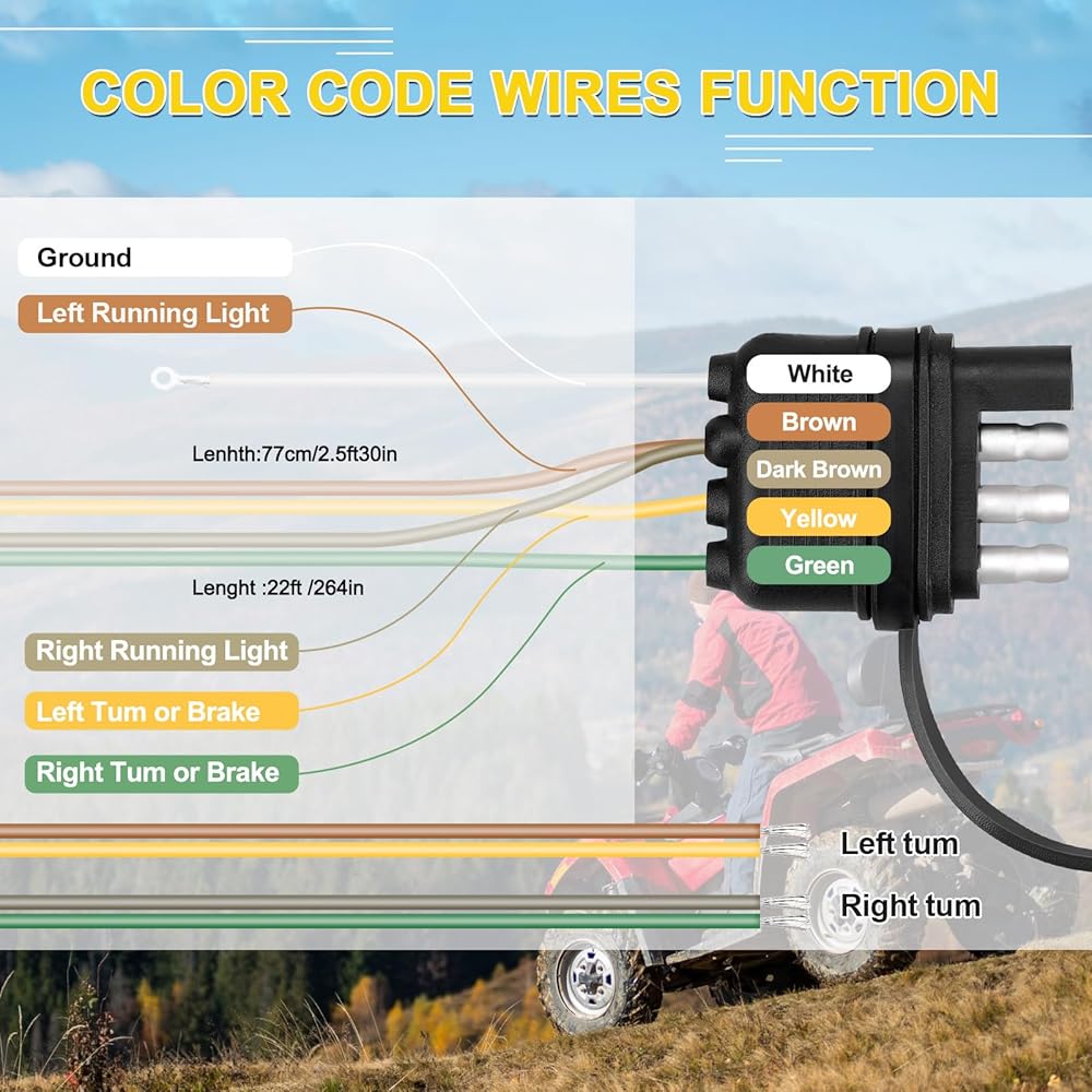 سرج أسلاك المقطورة بطول 22 قدمًا: تحتوي مجموعة أسلاك المقطورة على 5 أسلاك، مما يزيل متاعب الأسلاك الإضافية ويوفر سلكًا كافيًا لتوصيل جميع النقاط الضرورية دون وصلات أو وصلات معقدة. تناسب مجموعة أدوات أسلاك المقطورة المقطورات التي يصل حجمها إلى 80 بوصة وأعرض من 80 بوصة