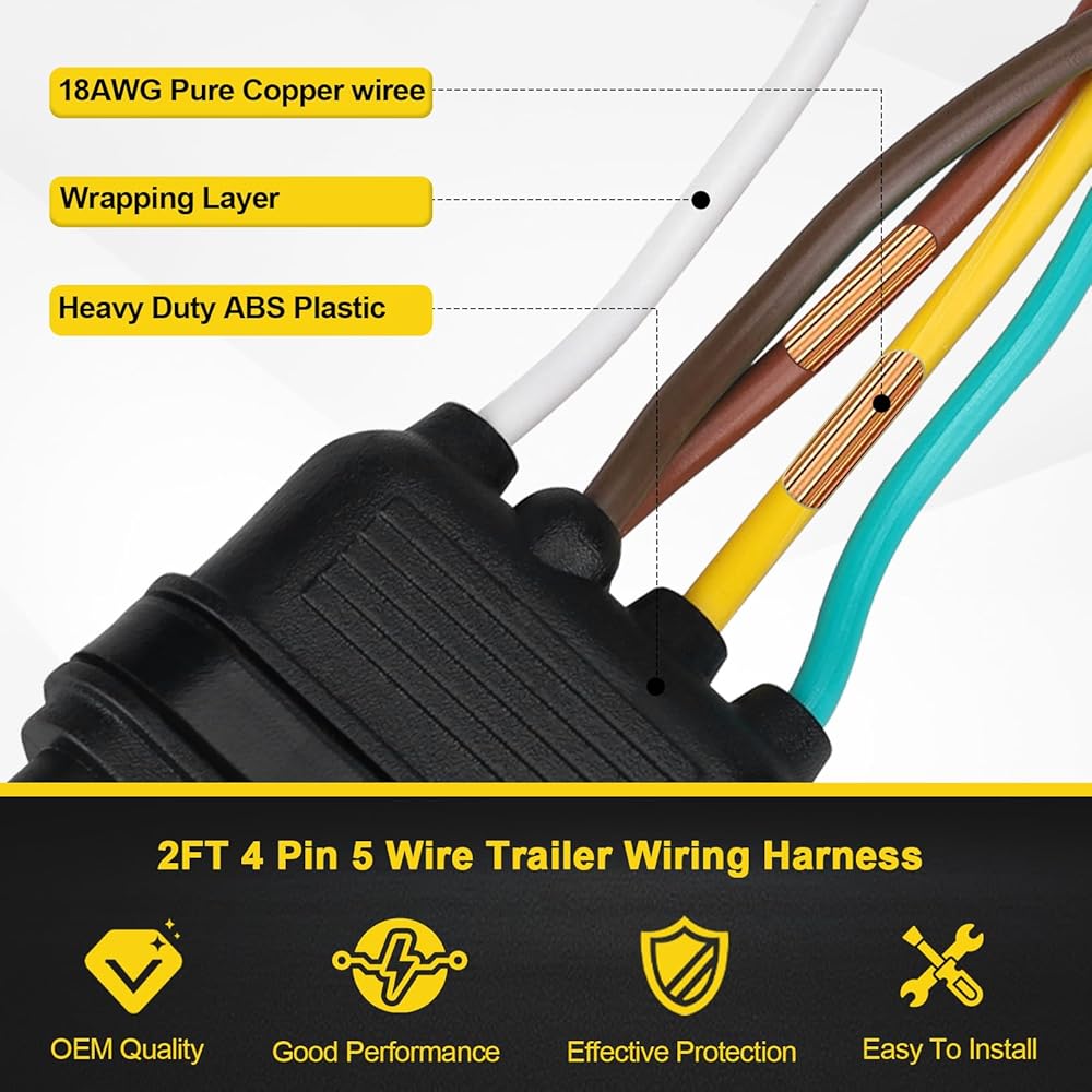 سرج أسلاك المقطورة ذو 4 دبابيس و5 أسلاك: يتميز محول سرج المقطورة ذو 4 دبابيس بتصميم متشعب مع تصميم على شكل حرف Y ينفصل عن جوانب مختلفة من المقطورة. يقع التصميم على شكل حرف Y في المقدمة، مما يلغي الحاجة إلى الجري الأسلاك من خلال المحور مثل معظم المحولات الأخرى. محول 4 Pin 5 Wire Trailer Wiring Harness هو تصميم متشعب ينقسم من جوانب مختلفة من المقطورة