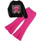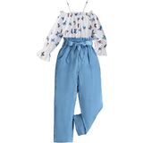 • Adorable two-piece outfit for girls featuring a butterfly-patterned off-shoulder top and pants.