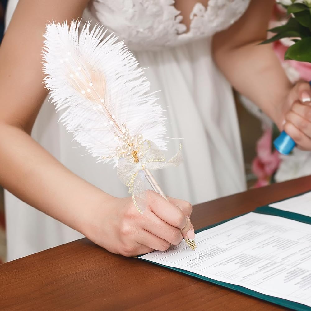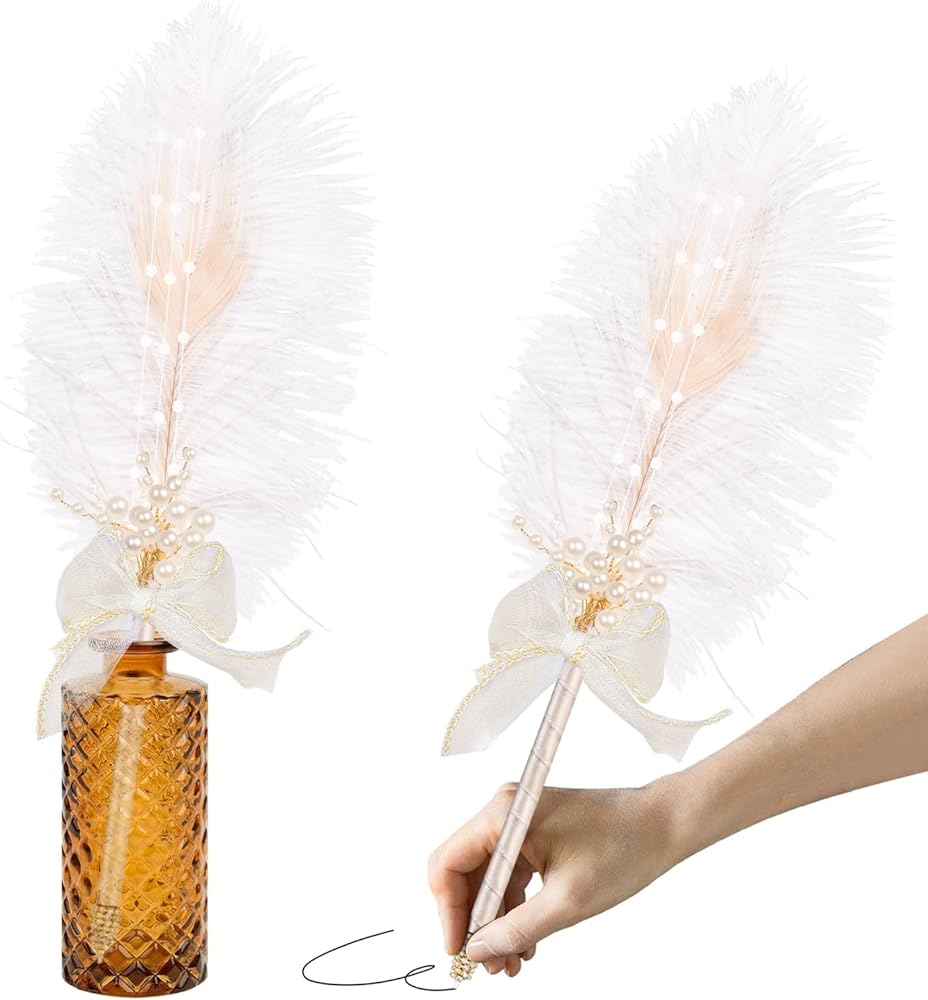 تشتمل مجموعة أقلام الريش الفاخرة هذه على قطعتين من الأحبار القابلة لإعادة التعبئة وتتميز بريش النعام الجميل وريش الطاووس الأبيض واللؤلؤ القابل للخرز وأقواس الشريط.
