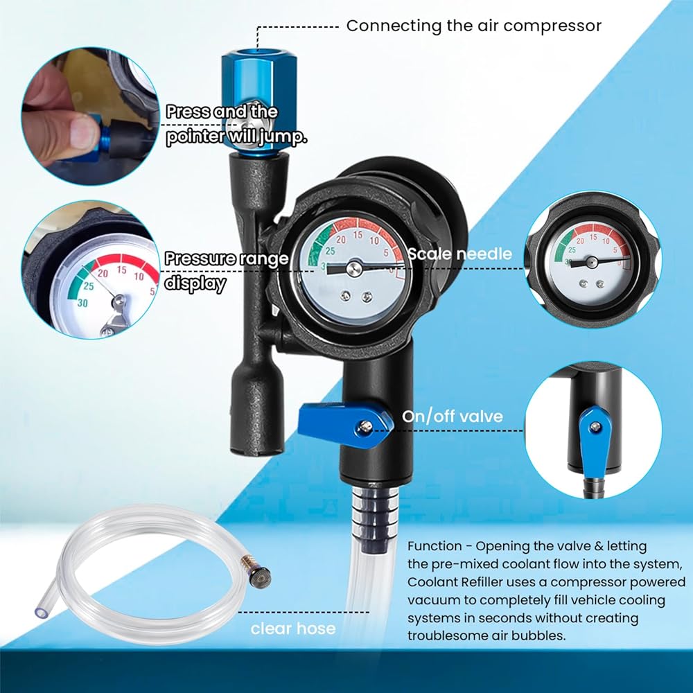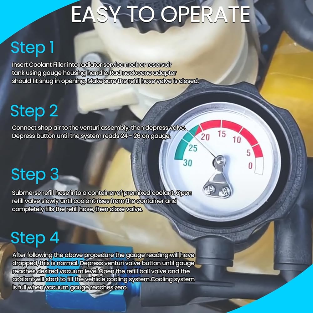 • Easy to use - Coolant replacement work needs a compressed air tool (an air compressor, but not included) to pull a vacuum in the cooling system, then sucks new fresh coolant into the entire system and eliminates air pockets. Please remember to drain out the waste coolant inside the system first.
