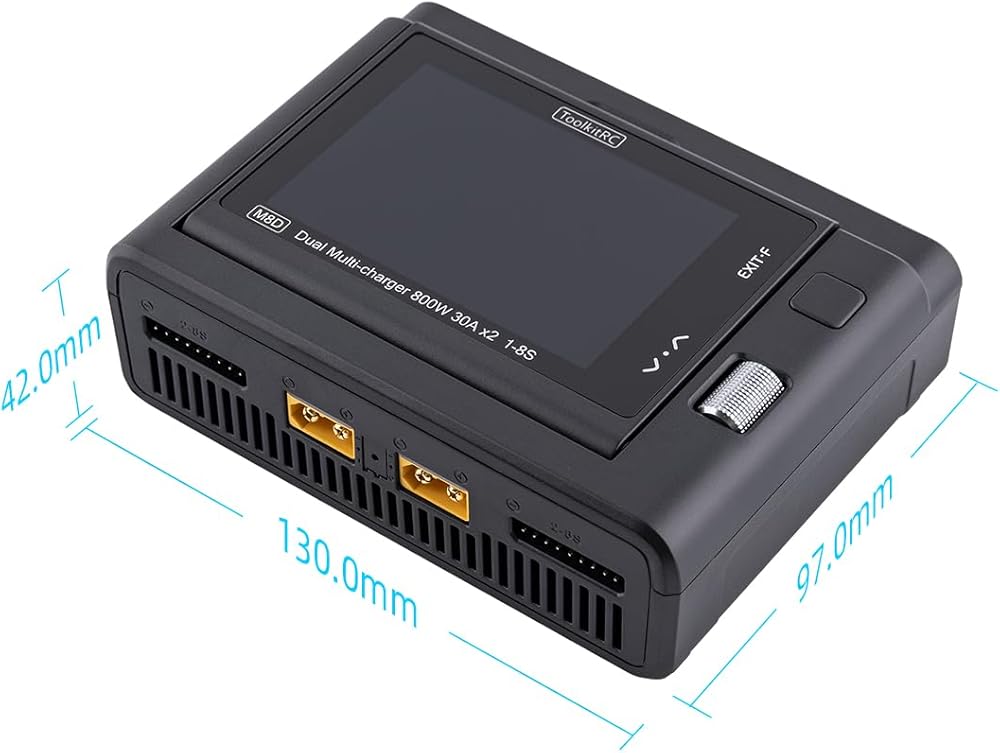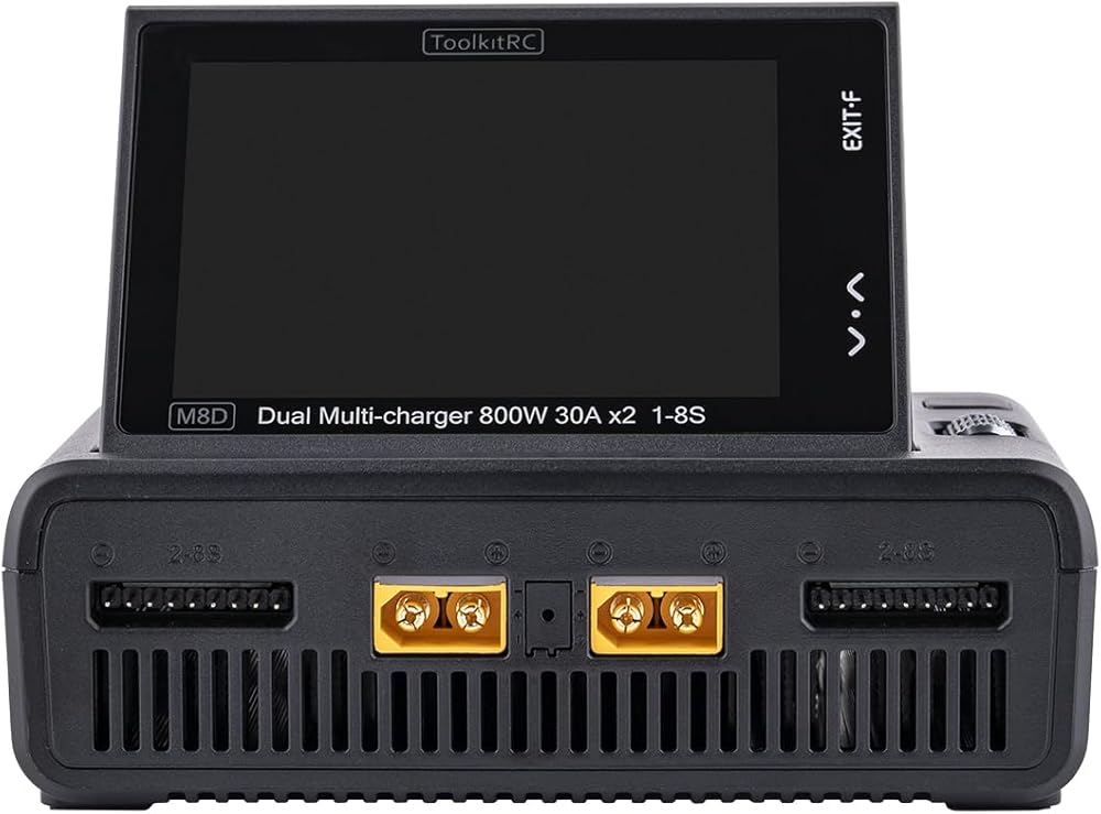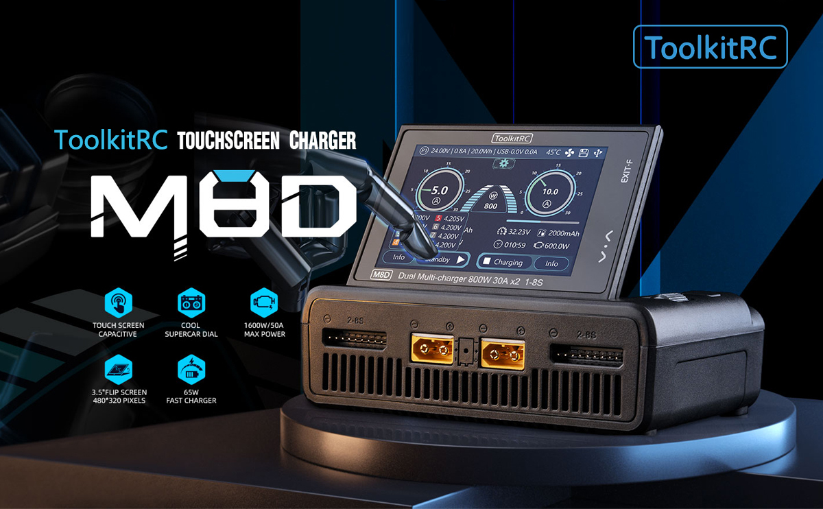 SoloGood ToolkitRC M8D شاشة تعمل باللمس شاحن مزدوج القنوات بحد أقصى 1600 وات 50 أمبير 3.5 بوصة شاشة قلابة 65 وات شاحن سريع لبطارية حياة 1-8S RC Lipo LiHV
