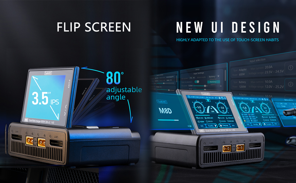 - ToolkitRC M8D هو شاحن يمكنه قلب الشاشة، مع شاشة LCD مقاس 3.5 بوصة وزاوية قابلة للتعديل تبلغ 80 درجة