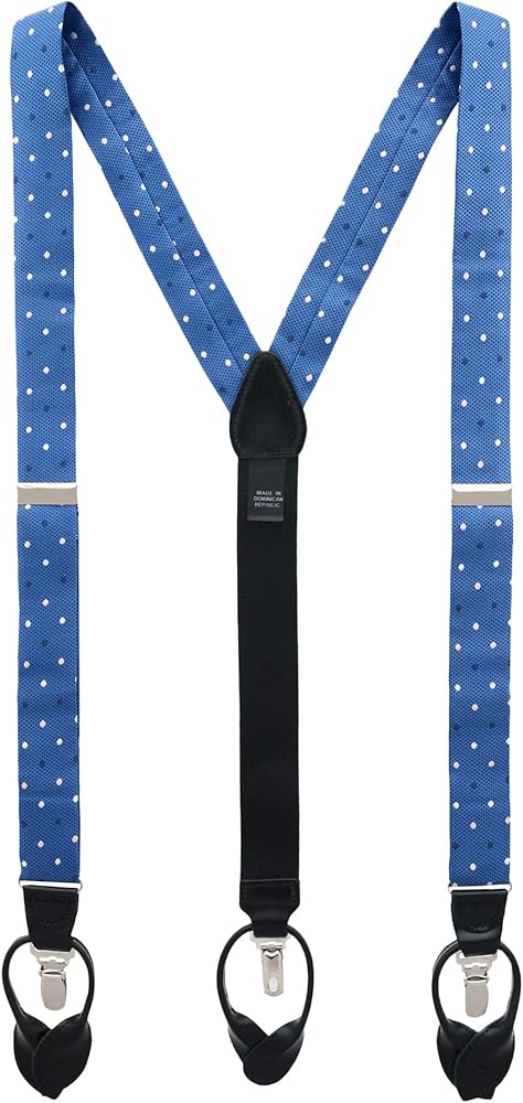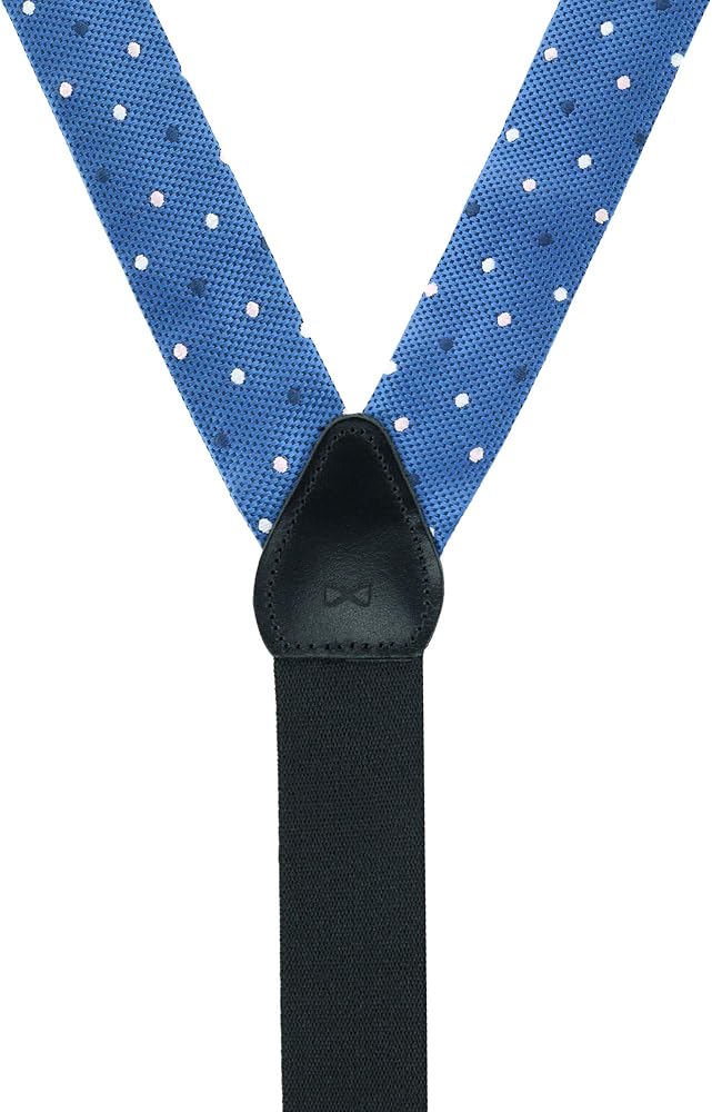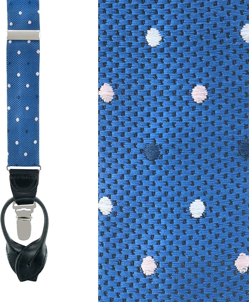 A beautiful base of blue with navy pin dot silk adorned by white and navy polka-dot design gives this brace a million dollar look that every man should have in his wardrobe. Whether it is with a suit for a board meeting or a pair of jeans for a night on the town, these convertible suspenders will give you the extra boost of confidence to let the man inside you shine and achieve your goals.