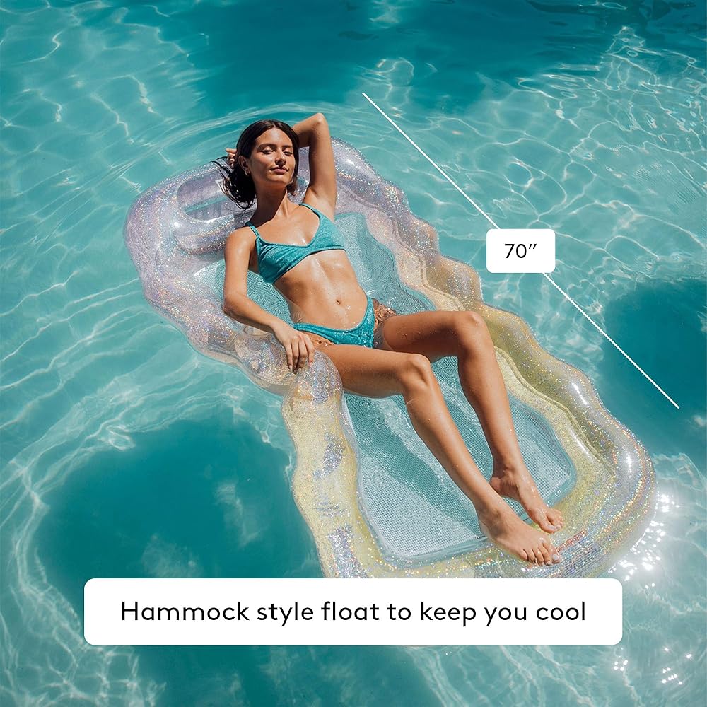 Limited Edition Ombre Colorway with glitter inside! Inflatable clear top with ombre printing inside and filled with super fun glitter. Outer tube keeps your body floating while the inner mesh allows water to cool your body during the hottest summer days.
