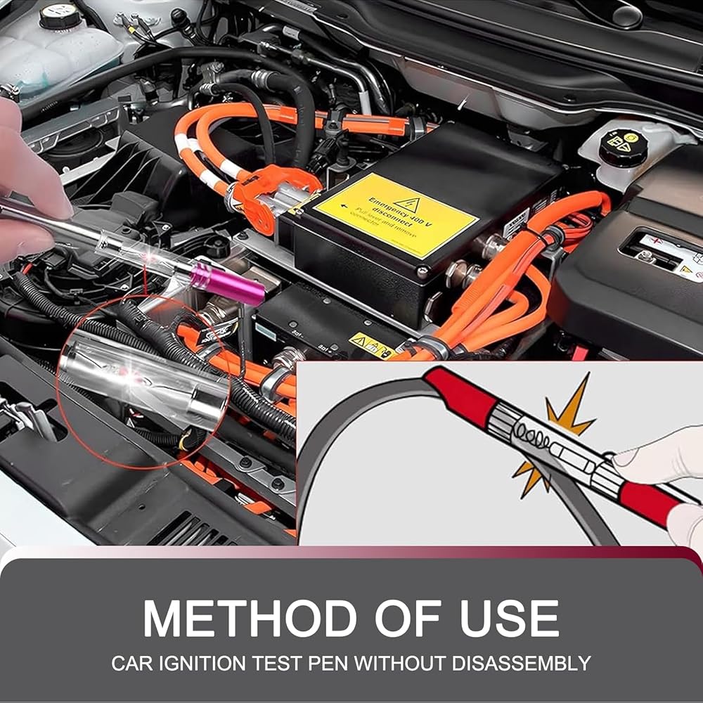• Function: This spark plug tester can be used for spark plug testing, high-voltage line testing, and ignition coil testing. It can directly determine whether the spark plug is working properly from the light indication of the test pen. Test spark plugs, spark plug wires and coils without piercing the wires.