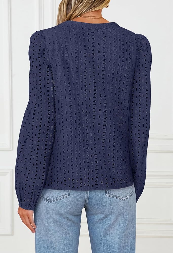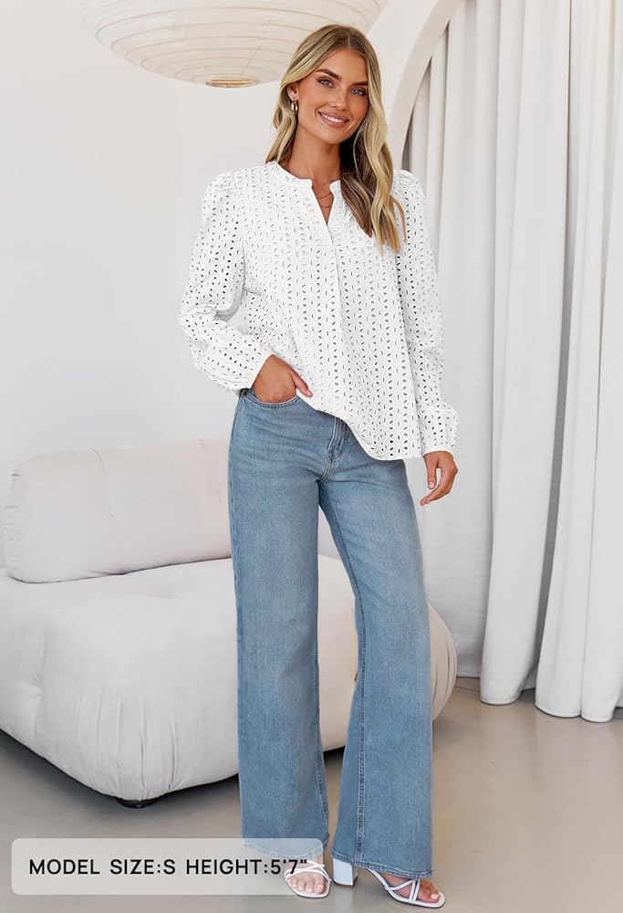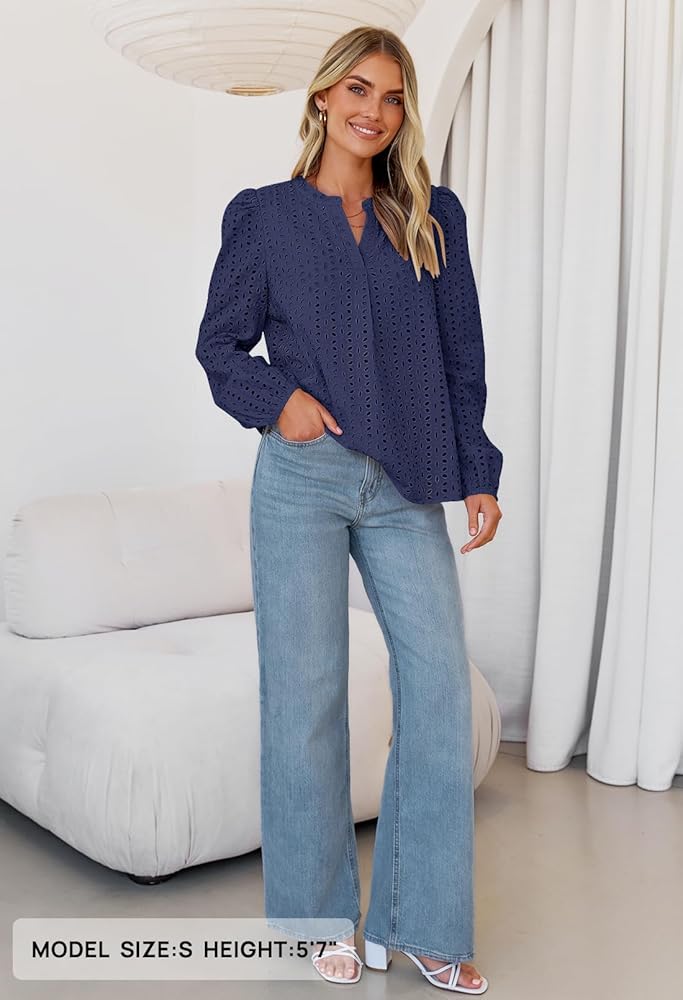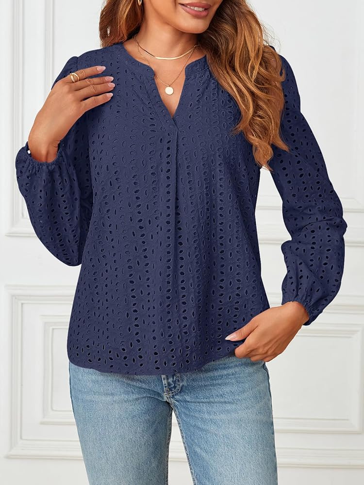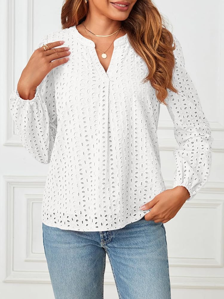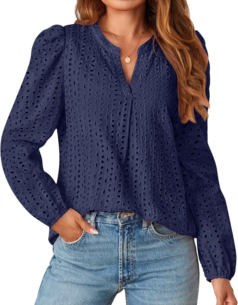 المزايا: جزء علوي بفتحات مجوفة، نمط كاجوال، رقبة على شكل حرف V، أكمام طويلة منتفخة، دانتيل مطرز بالزهور، مقاس فضفاض، قمصان وبلوزات للإجازات للسيدات، قمصان نسائية كاجوال، قمصان عصرية للسيدات.