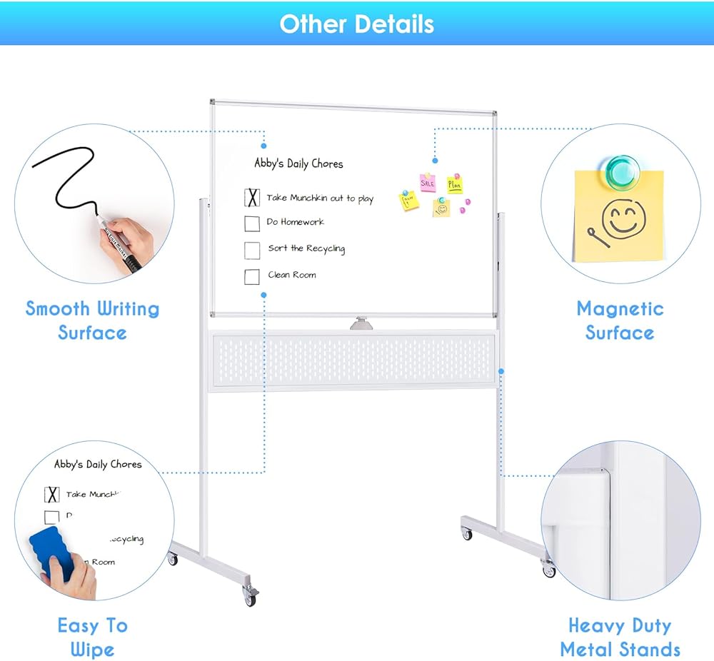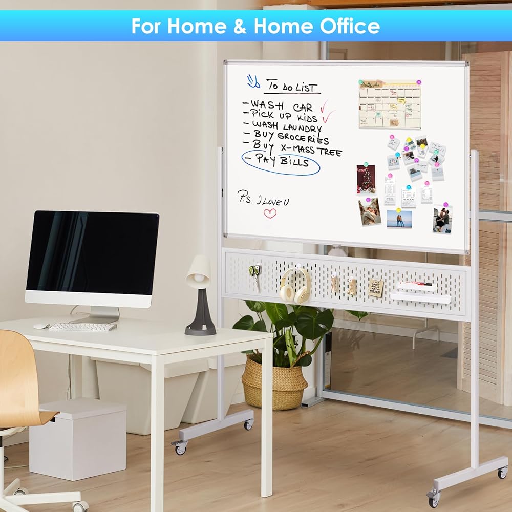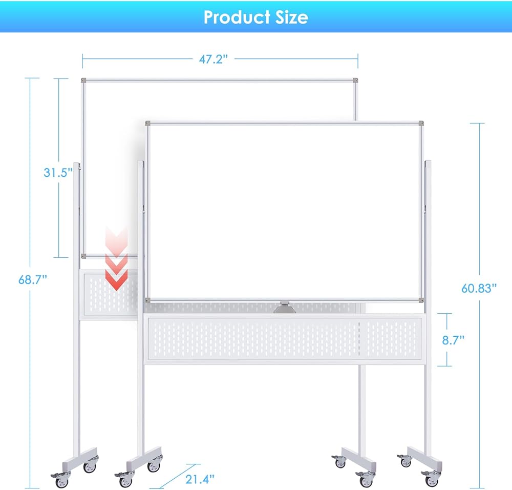 سبورة بيضاء متدحرجة مقاس 48 × 32، لوحة بيضاء متنقلة كبيرة الحجم من Maxtek على عجلات، حامل مزدوج الجوانب مع لوحة تعليق، لوح مسح جاف قابل للتعديل مع خطافين وصينيتين للمنزل والمكتب والفصول الدراسية