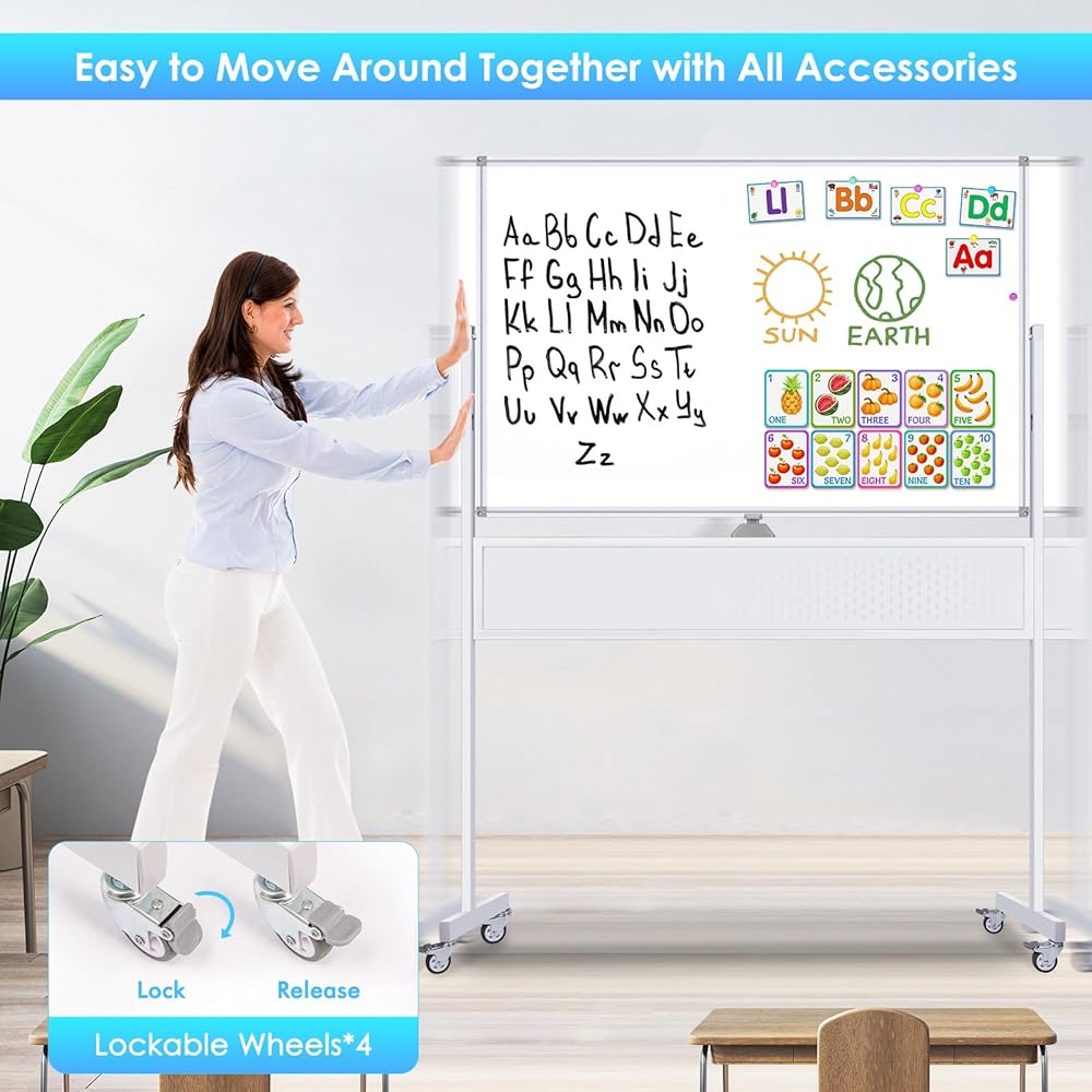 سهلة الحركة: تم تصميم هذه السبورة بإطار قوي للخدمة الشاقة ومجهزة بأربع عجلات عالمية، وتوفر دورانًا بزاوية 360 درجة لحركة سهلة عبر الأسطح المختلفة - سواء كانت أسمنتية أو بلاطًا أو لوحًا خشبيًا أو سجادًا. لا يضمن نظام القفل المتكامل الاستقرار أثناء الاستخدام فحسب، بل يسمح أيضًا بالانتقال السريع إلى غرف أو مناطق مختلفة، مما يعزز المرونة في مساحة العمل الخاصة بك.