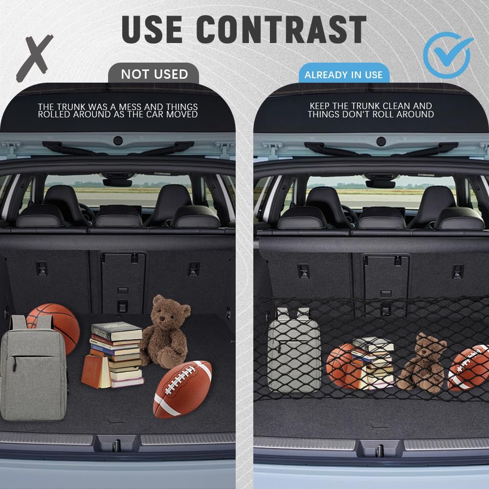 • [توفير المساحة وسهولة التخزين]: شبكة الشحن الخلفية للسيارة يمكنها تثبيت البضائع عند القيادة ولم تعد تهتز، ولا تشغل مساحة، وسهلة الالتقاط والتخزين، والاستفادة الكاملة من المساحة الجانبية لصندوق السيارة، وإدارة فعالة المساحة داخل السيارة، تحافظ على نظافة السيارة ومنظمة.
