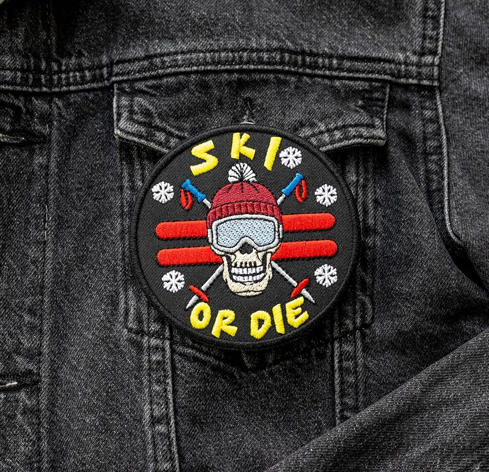 Skiing with Attitude: Embrace the slopes with a touch of humor - our "Ski or Die" patch features a funny skull donning ski gear, perfect for those who tackle the mountains with a sarcastic edge.