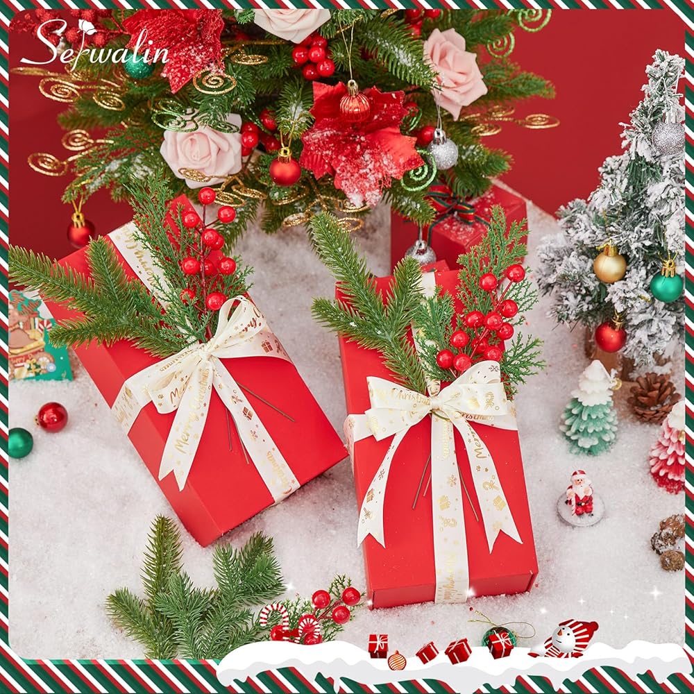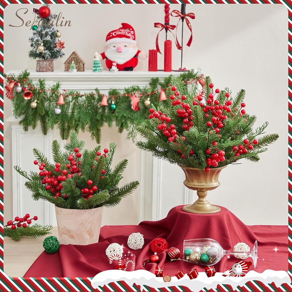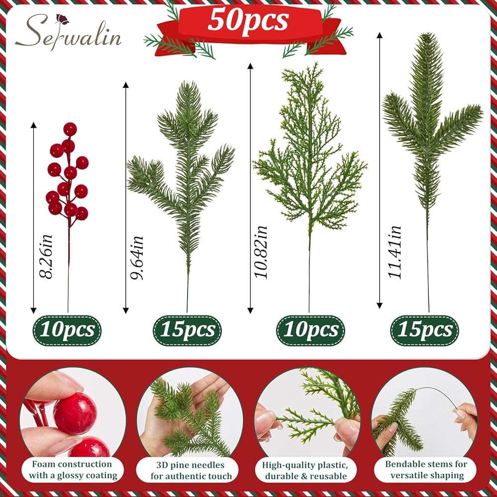 Serwalin 50 قطعة من فروع الصنوبر الاصطناعي مع سيقان التوت الأحمر، سيقان خضراء لعيد الميلاد المزيفة، إبر الصنوبر ذات اللمس الحقيقي لإكليل عيد الميلاد DIY وإكليل عيد الميلاد وترتيبات المنزل