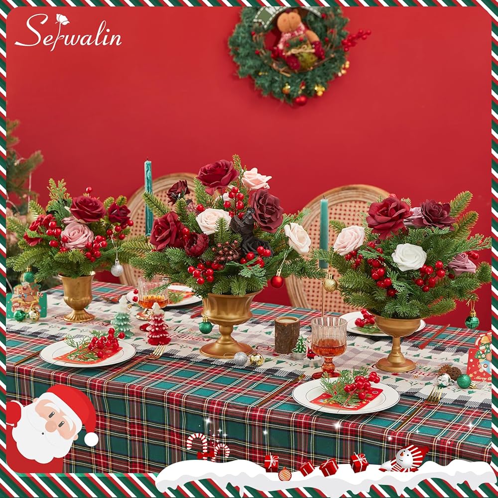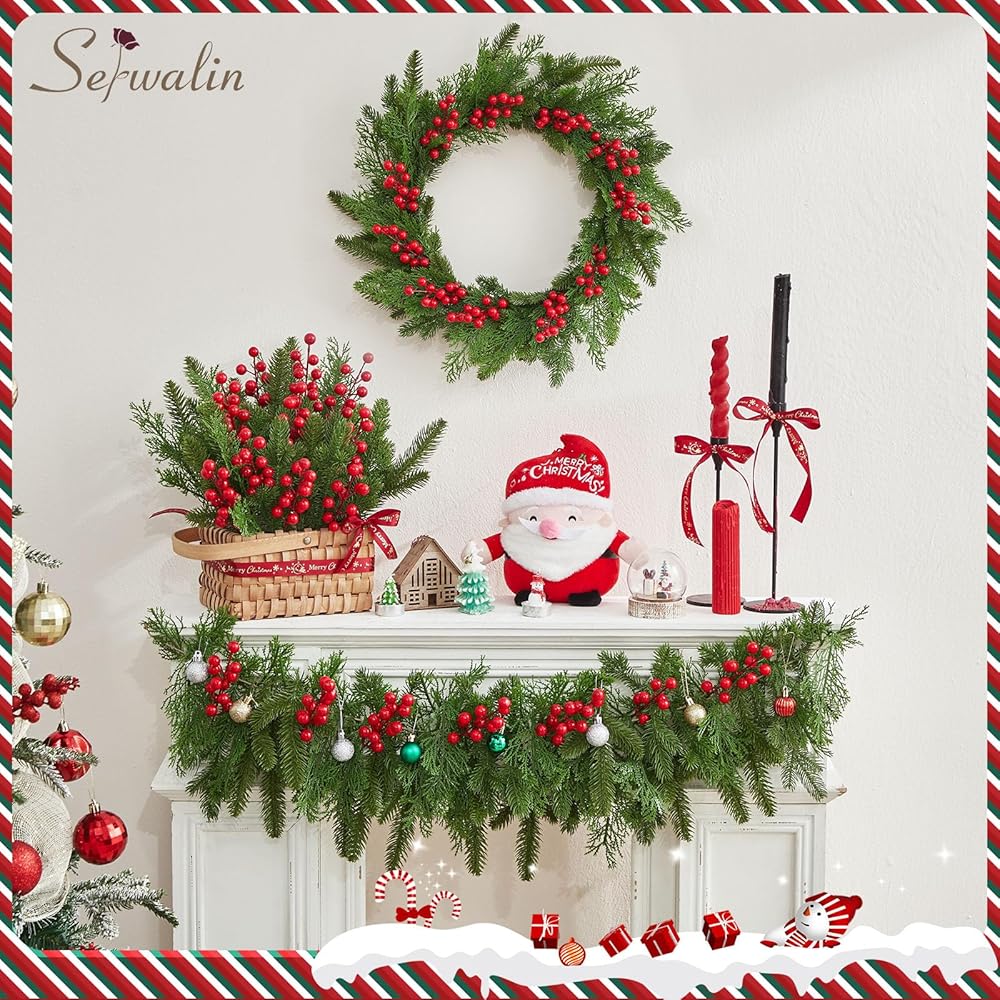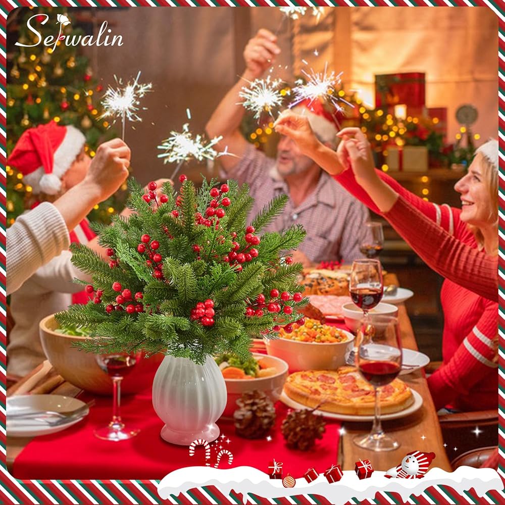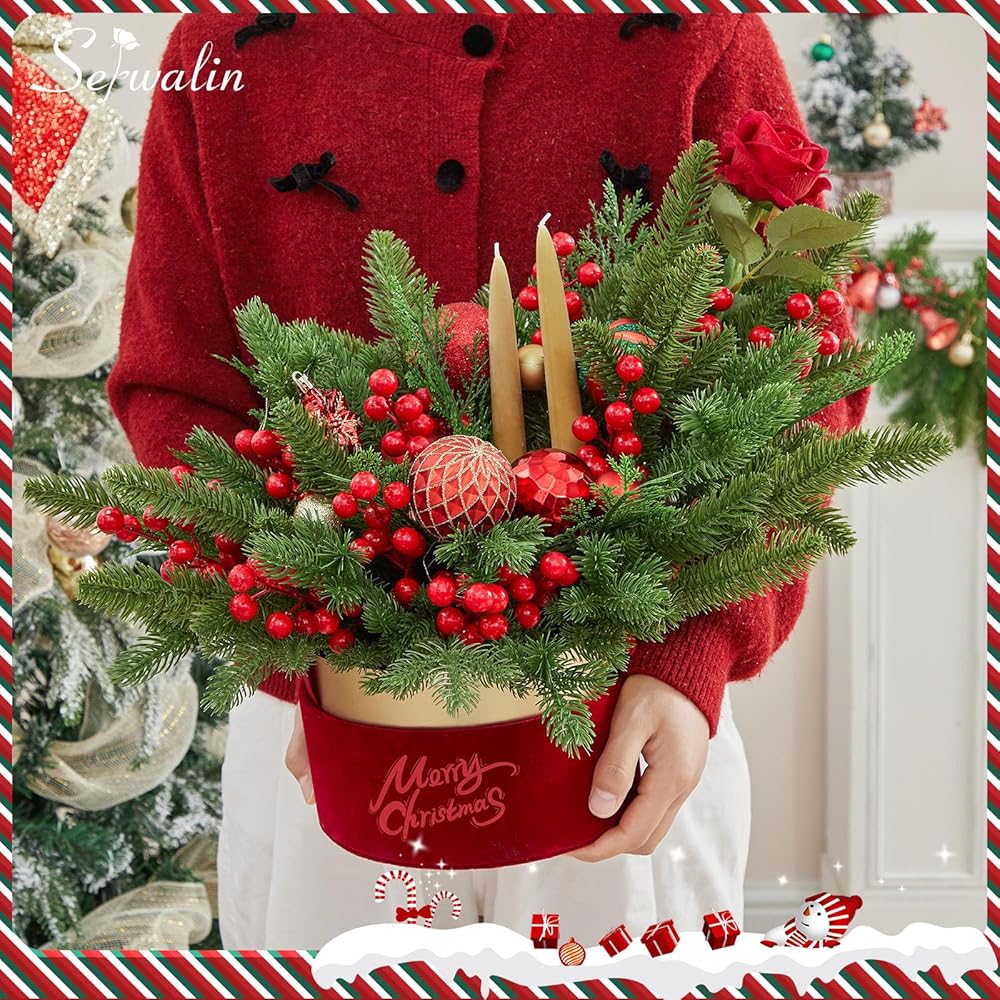 Serwalin 50 قطعة من فروع الصنوبر الاصطناعي مع سيقان التوت الأحمر، سيقان خضراء لعيد الميلاد المزيفة، إبر الصنوبر ذات اللمس الحقيقي لإكليل عيد الميلاد DIY وإكليل عيد الميلاد وترتيبات المنزل