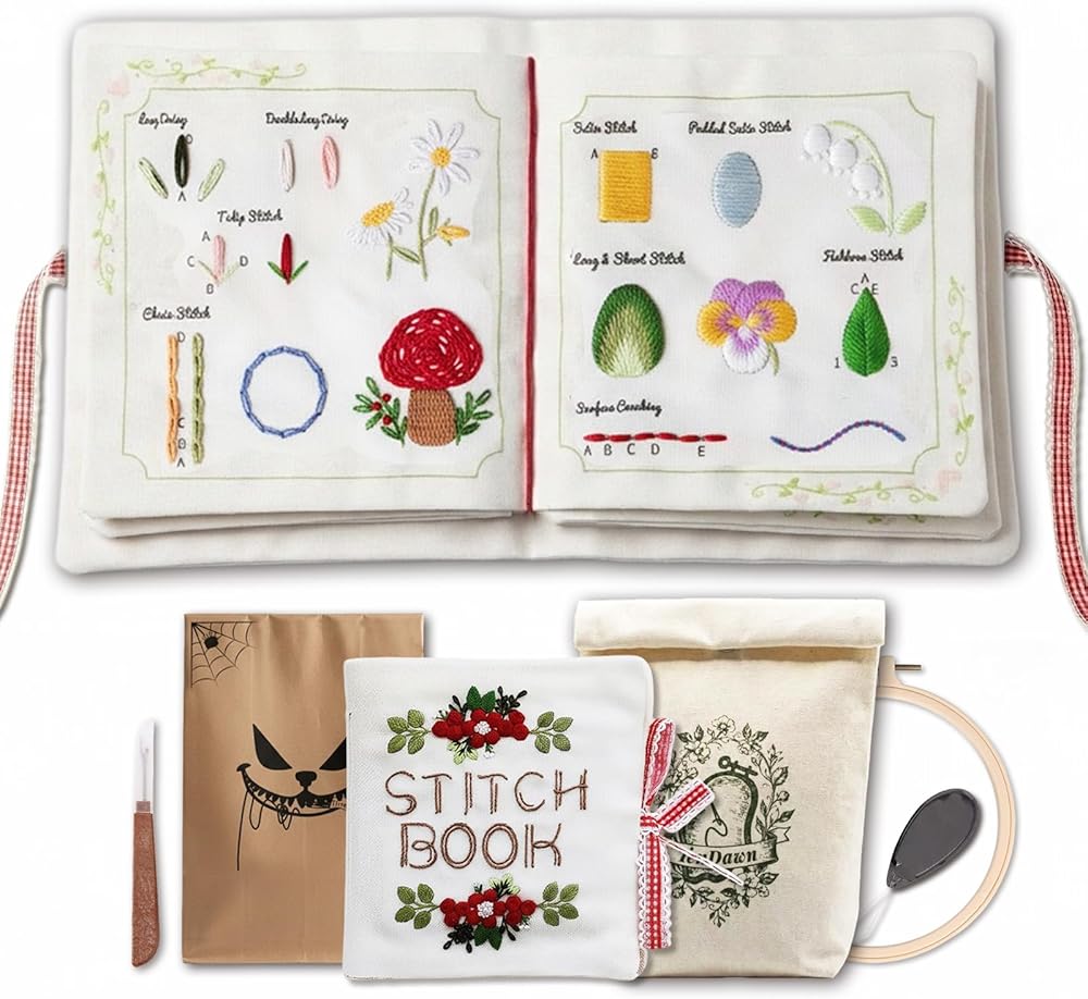 كتاب غرز التطريز للمبتدئين من TenDawn مع صفحات قماشية، 30 غرزة تطريز يدوية للبالغين، طقم خياطة DIY مع زخارف نباتية، أنماط ممارسة المبتدئين، هدية لمحبي الحرف اليدوية