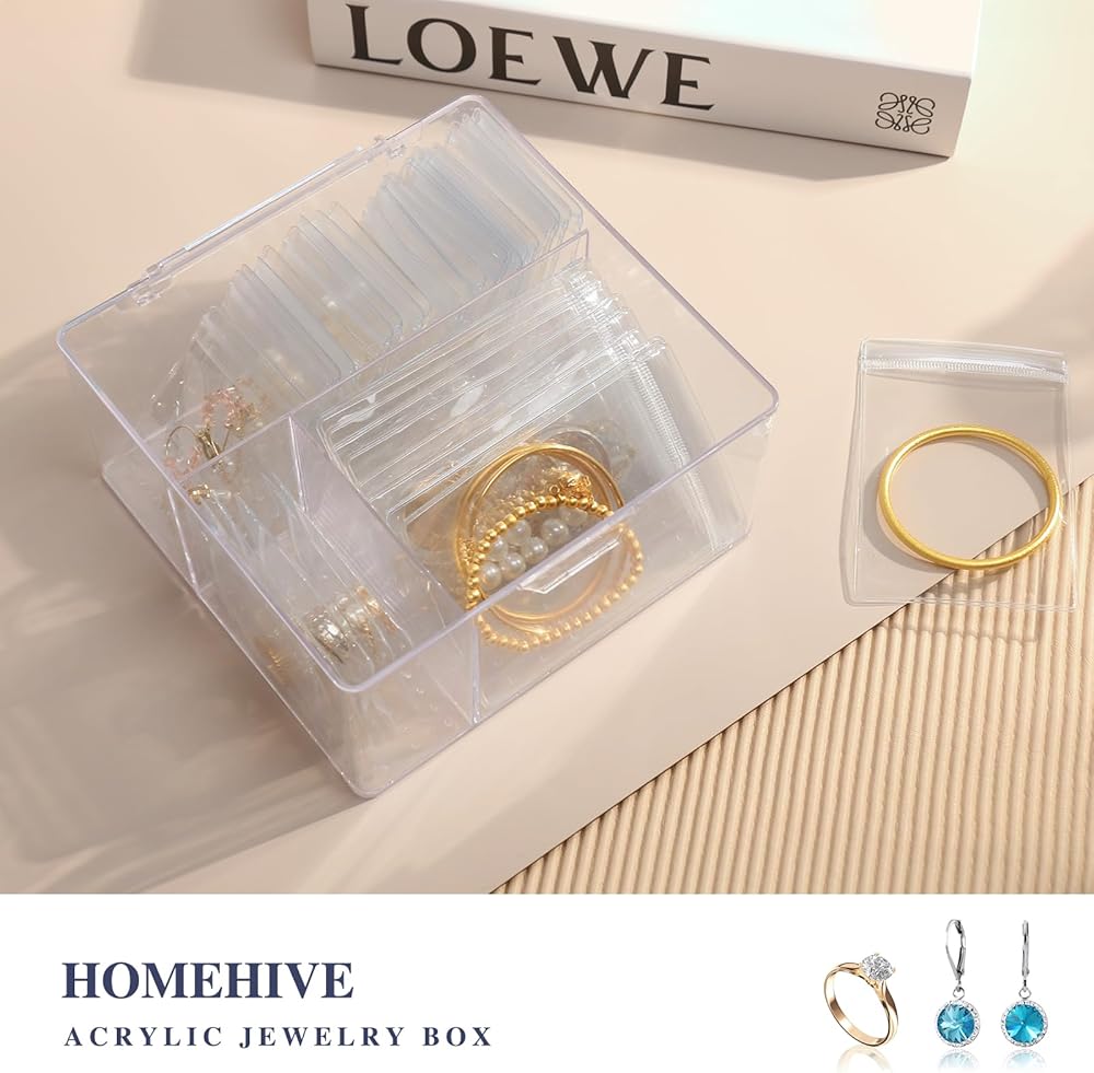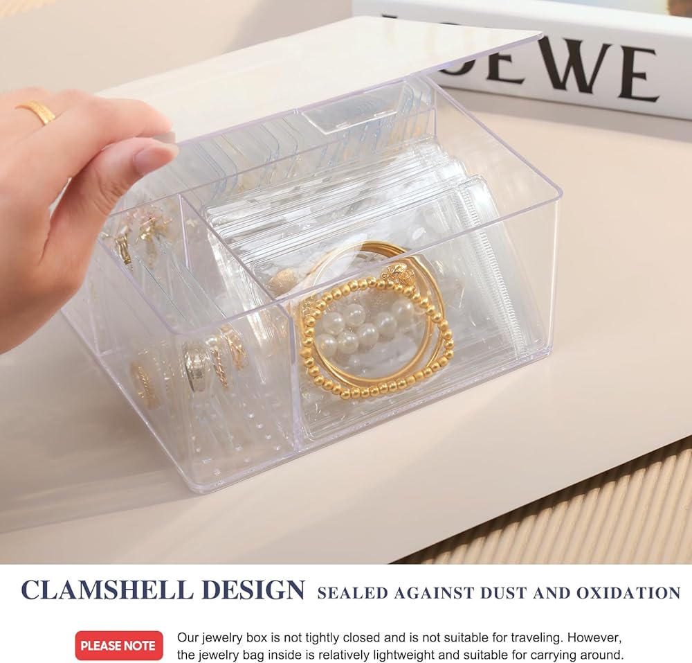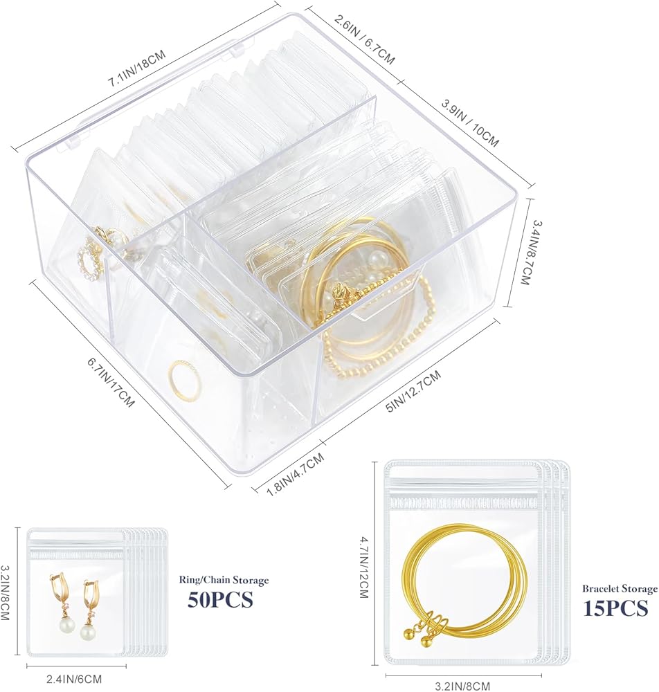 حل تخزين المجوهرات متعدد الاستخدامات: تأتي المجموعة مع 65 حقيبة مجوهرات من مادة PVC: 15 حقيبة كبيرة (4.78 بوصة × 3.12 بوصة) مثالية للأساور، و50 حقيبة متوسطة (2.39 بوصة × 3.19 بوصة) مناسبة للأقراط والخواتم وغيرها من الأشياء الصغيرة. الحقائب مصنوعة من مادة PVC عالية الجودة ومصممة للحفاظ على مجوهراتك جافة ومنظمة ومحمية من الغبار والرطوبة.