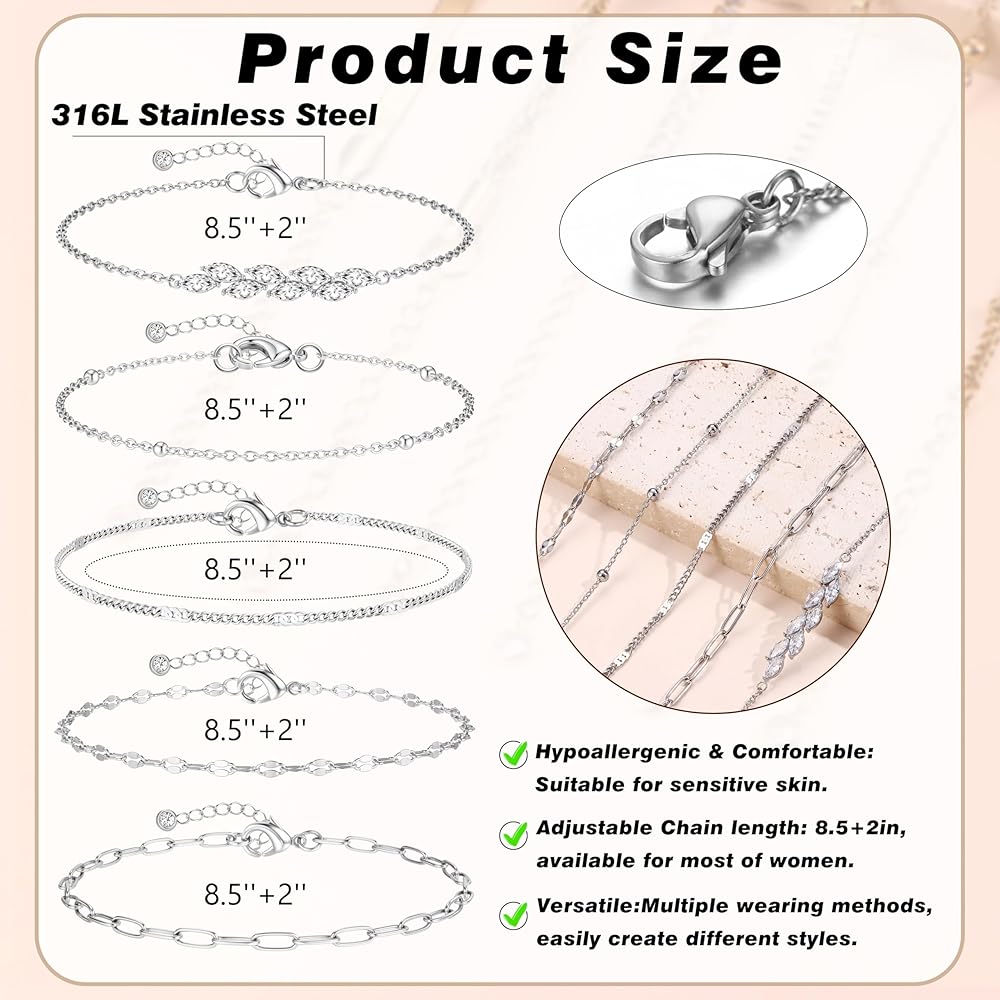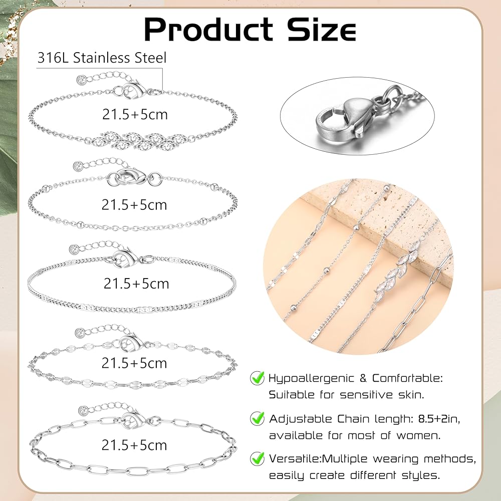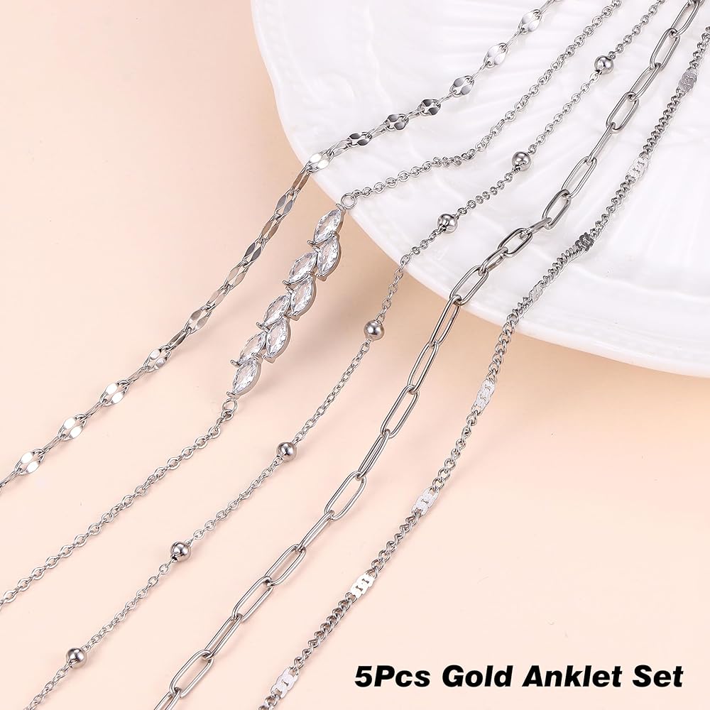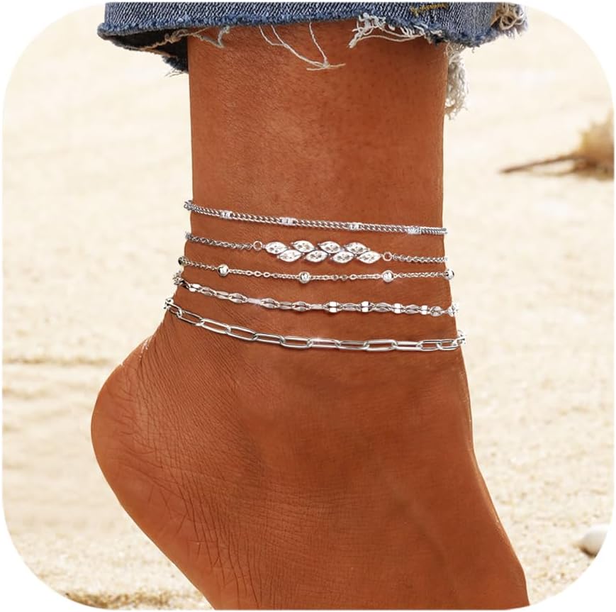 5 قطع من سوار الكاحل ذو الطبقات: 5 سلاسل منفصلة، تتوفر أنماط سلاسل مختلفة لتختار من بينها. بما في ذلك السلسلة الكوبية/سلسلة ربط مشبك الورق/سلسلة القلب/سلسلة فيجارو/سلسلة الثعبان/سلسلة التنس/قلادة متقاطعة. يمكن ارتداء كل سوار كاحل ذهبي بشكل منفصل أو ارتداؤه معًا، أو مع كاحل آخر لخلق أسلوبه الخاص