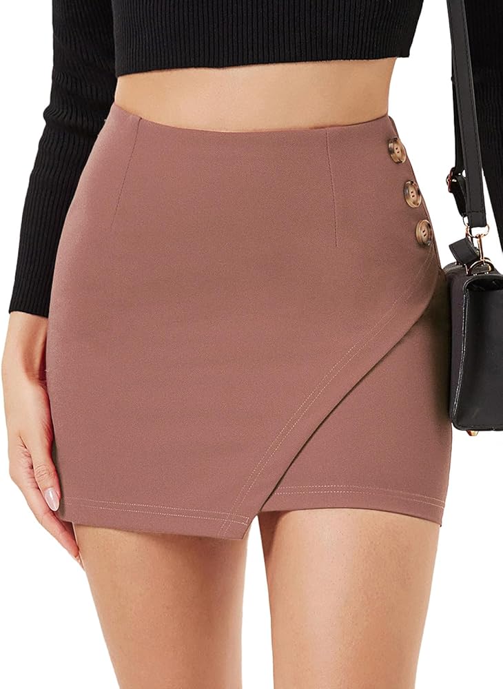 تصميم أنيق وأنيق: تتميز تنانيرنا القصيرة للنساء بواجهة فريدة من نوعها مزدوجة الطبقات وصورة ظلية أنيقة للتنورة الضيقة المريحة والأنيقة. يضيف القص الأمامي المائل مع الأزرار الزخرفية لمسة راقية، في حين أن الطول الصغير والتصميم الضيق يبرزان شكلك بشكل جميل.