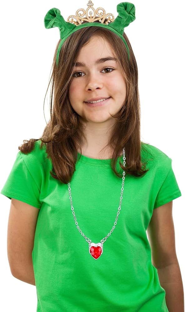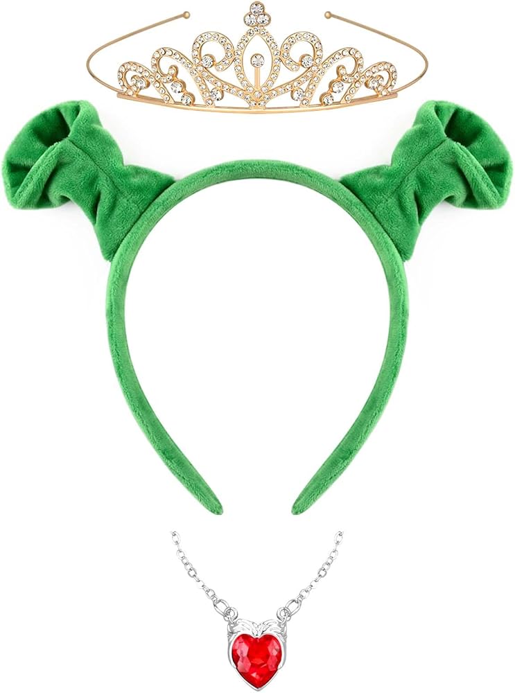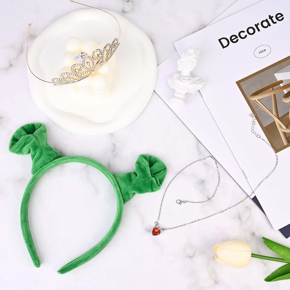 1 green ears headband, 1 princess crown, 1 heart necklace