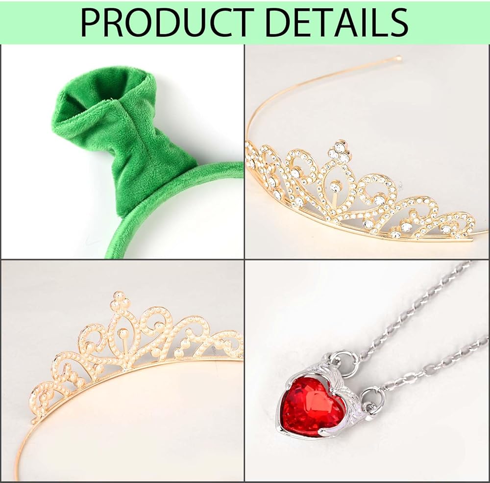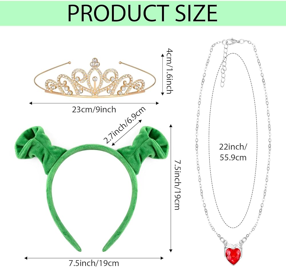 Package Included: This monster cosplay set includes 1 green ears headband, 1 princess crown, and 1 heart necklace.