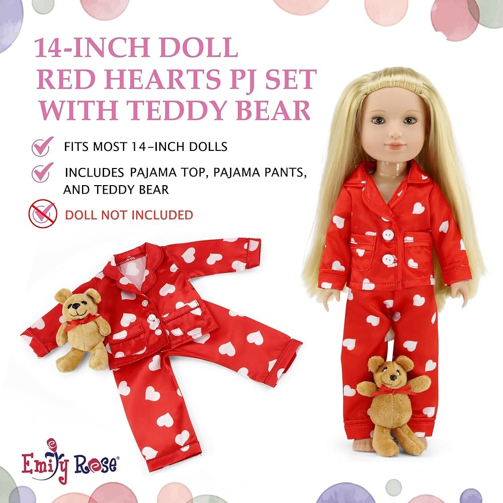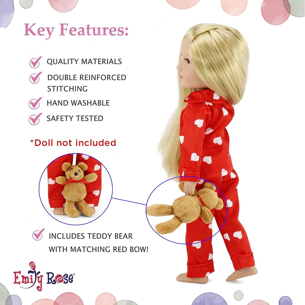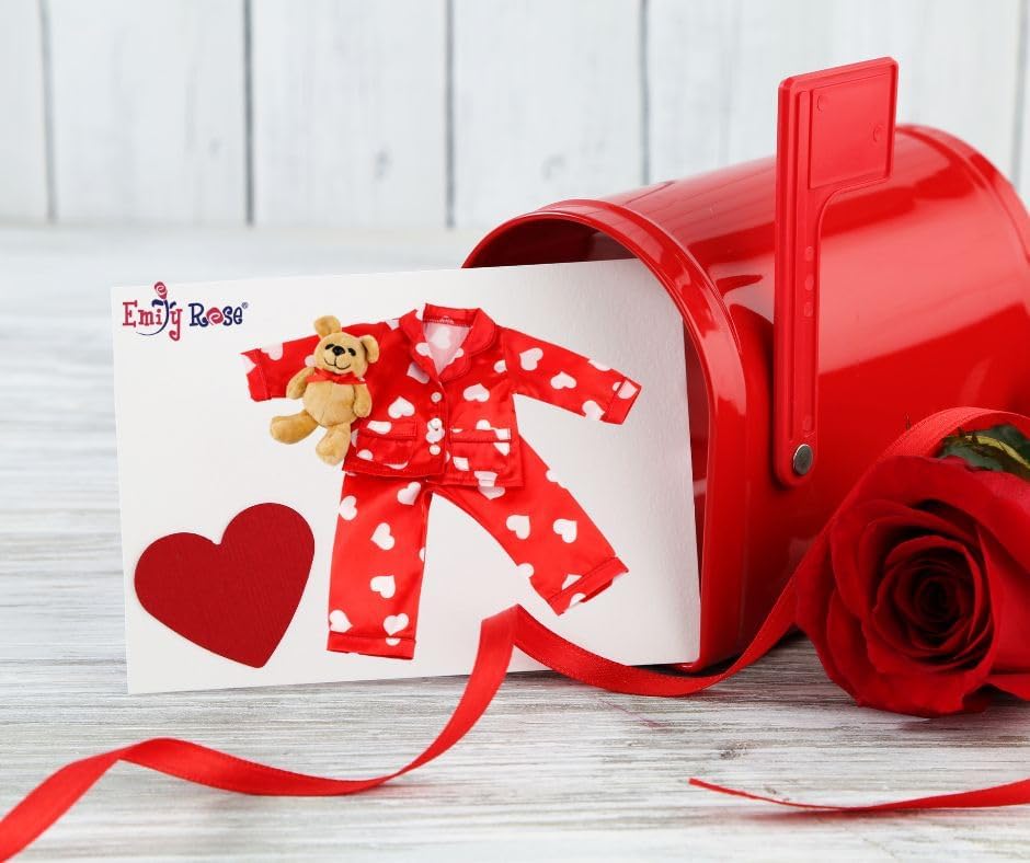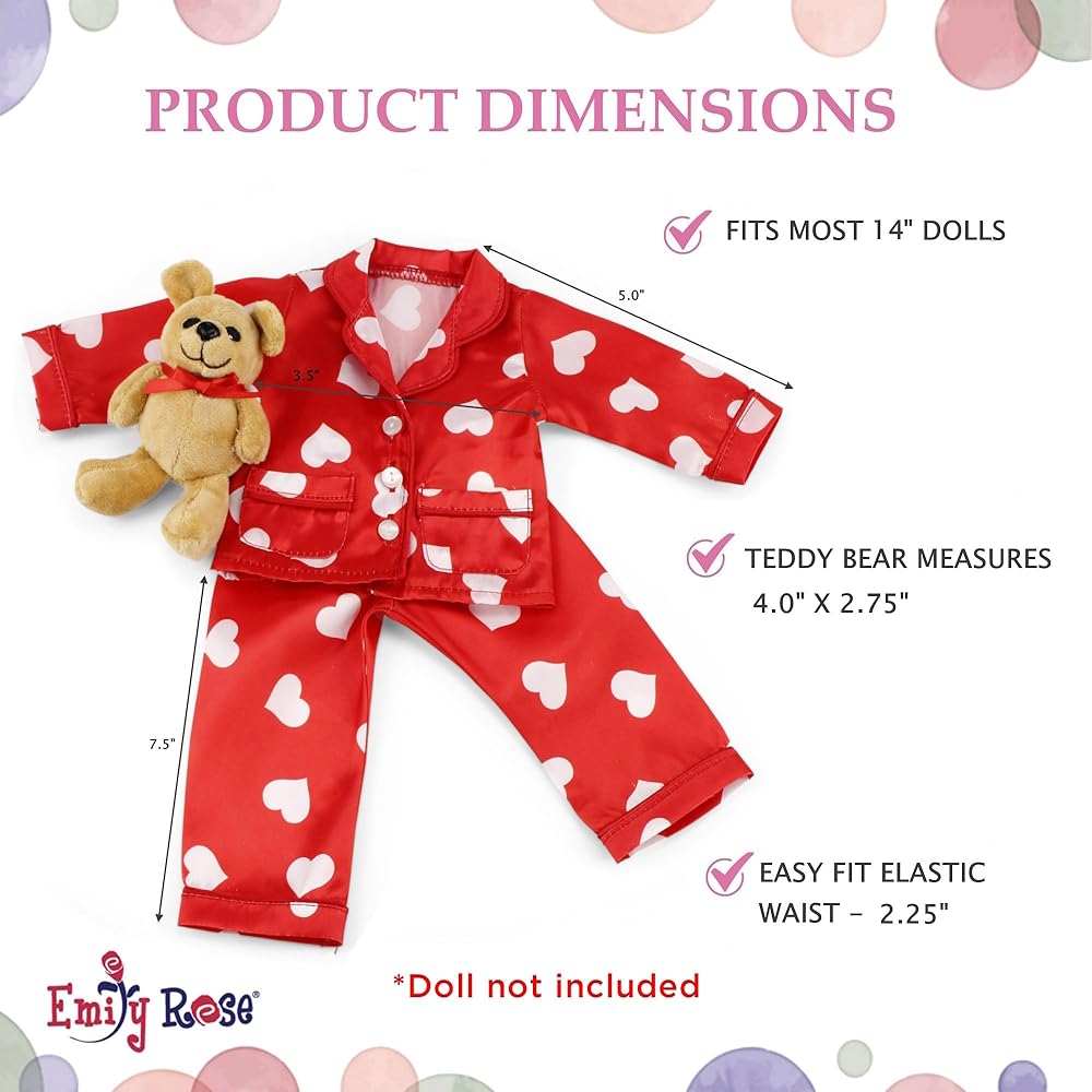 إميلي روز 14 بوصة ملابس الدمية 3-PC 14-in Doll Red Heart PJ Pajamas Set | مجموعة هدايا عيد الحب من دمية حريرية مقاس 35.56 سم مع ملحقات تيدي بير | متوافقة مع دمى American Girl Wellie Wishers مقاس 14 بوصة