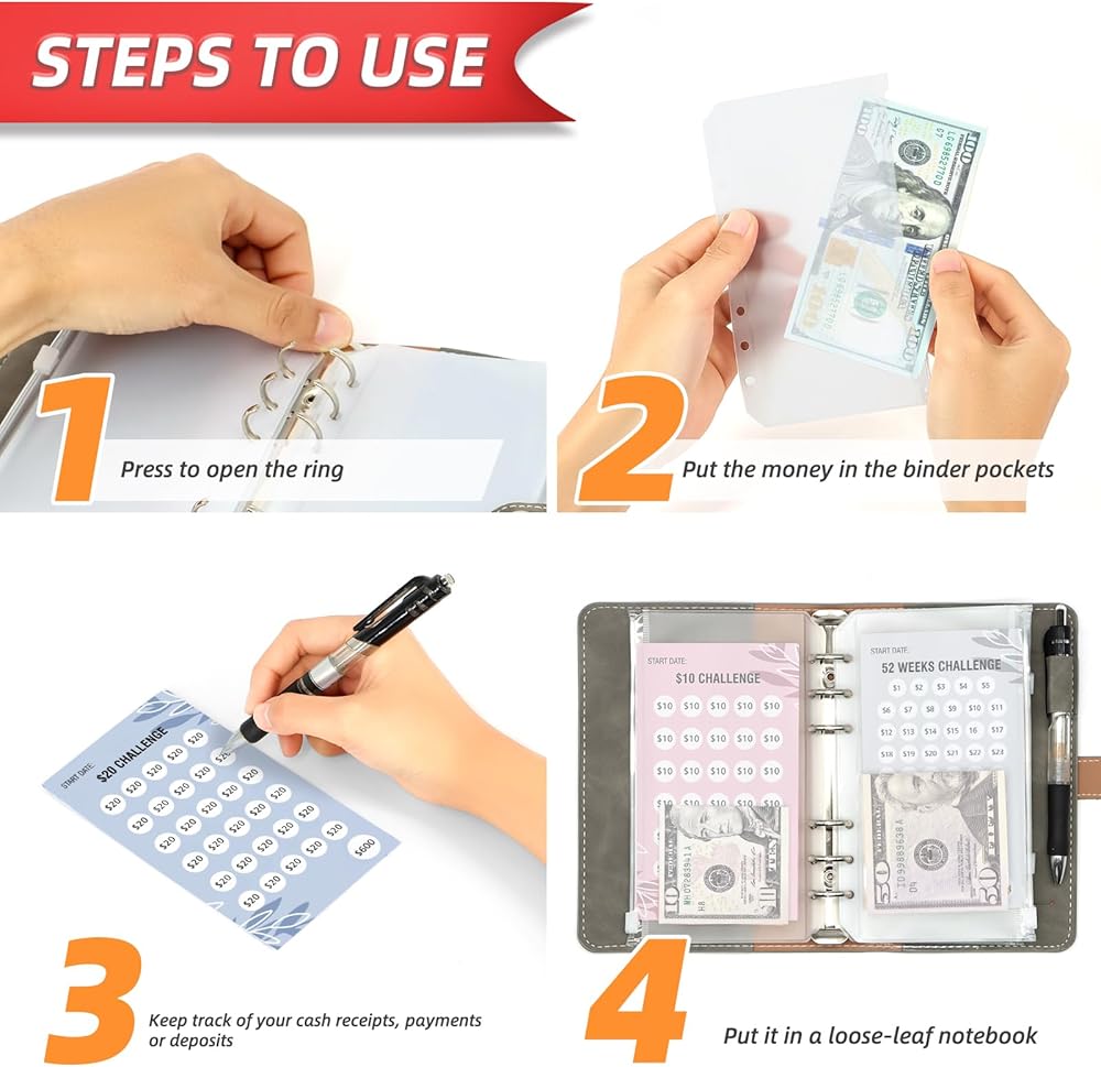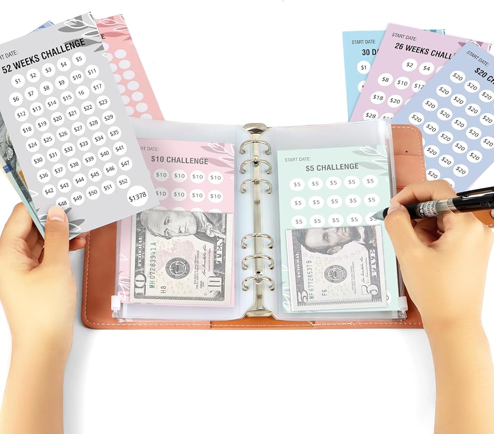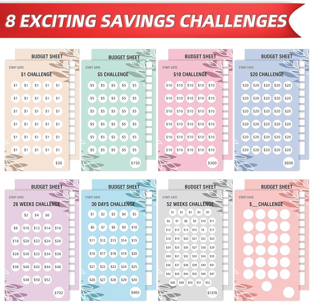 Giftota 32Pcs Budget Binder Savings Challenge Trackers for Budget Planner, Money Saving Wallet Cash Organizer Book Cards with $1, $2, POCKET MONEY, DICE Challenge, 26 WEEKS, 30 DAYS, DIY
