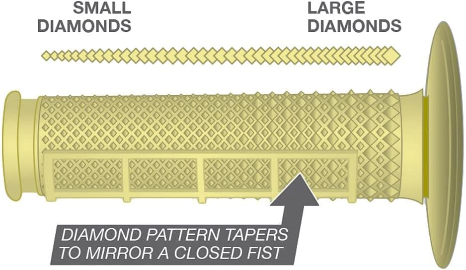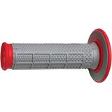 Renthal Red/Gray Diamond/Waffle Soft/Firm Compound Tapered Motocross Grip features the tapered grip. It breaks new ground, offering all the benefits of the dual compound grip but with an oversized thumb diameter, which tapers down to regular size at the ends. This mirrors the contours of a closed fist to offer maximum comfort and control. Covered by Patent GB2395174 and US7044020.