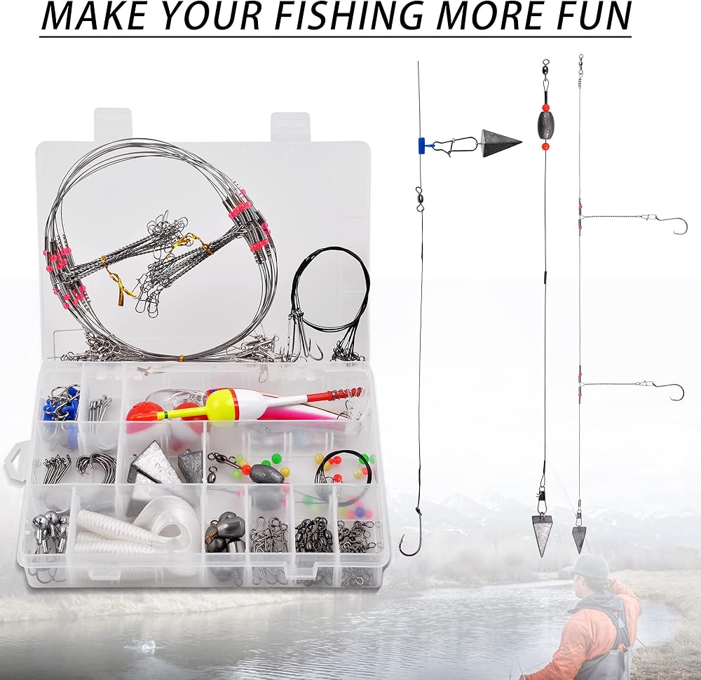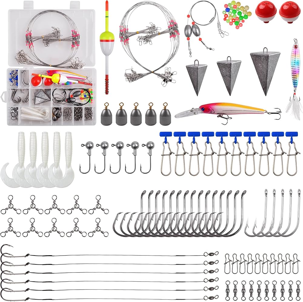 مجموعة أدوات صيد الأسماك في المياه المالحة - 138 قطعة من أدوات صيد الأسماك في المياه المالحة تتضمن ثقوب هرمية منزلقة وأوزان البيض ورؤوس تهزهز صيد الأسماك في المياه العذبة وخطافات طُعم ودوارة وقفل مزدوج وخرز مجموعة أسماك
