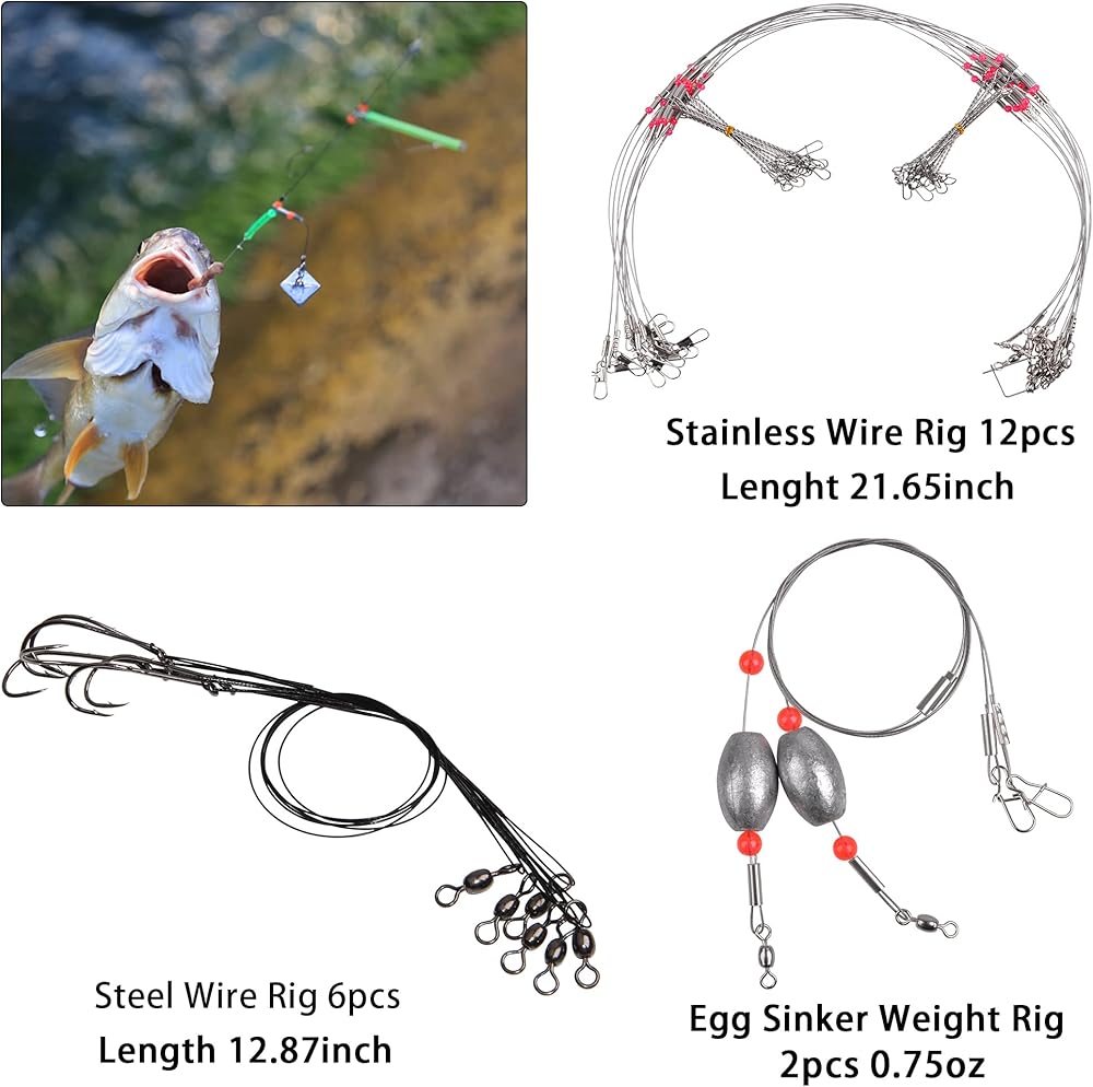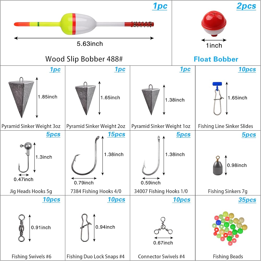 مجموعة صيد الأمواج - 138 قطعة تتضمن منصة القيادة (12)، منصة الخطاف (6)، غطاس البيض (2)، ملعقة القفز (1)، أسماك البلمة (1)، طعم اليرقة (5)، خطاف دائري (15)، خطاف J (5)، خطاف رأس هزاز (5)، دوار ثلاثي الاتجاهات (10)، دوار أسطواني (10)، أزرار كبس (10)، منزلق غاطس (10)، مغطس هرمي (3)، مغطس جرس (5)، بوبر مستدير( 2)، تعويم الانزلاق (1)، الخرز (35).