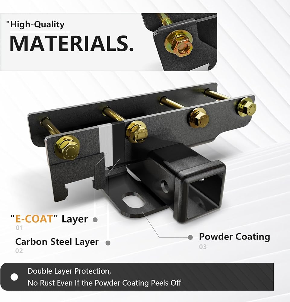 【سهلة التركيب】تركيب وصلة المقطورة Jeep JL هذه سريع ومباشر. إنها تستخدم طريقة تركيب مباشرة بمسامير، وتتصل بسلاسة بالهيكل الحالي لسيارتك. ليست هناك حاجة لأي تعديلات أو أدوات إضافية، مما يسمح لك بإكمال التثبيت في وقت قصير والاستمتاع براحة السحب.