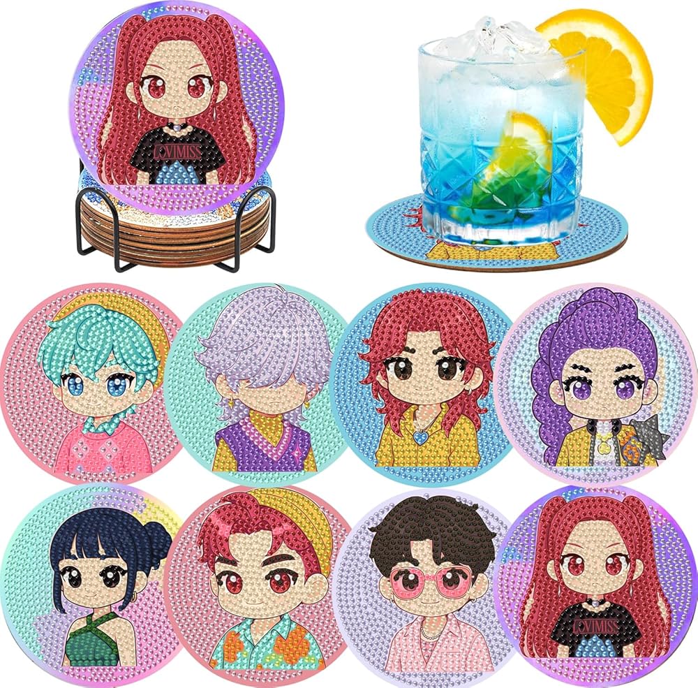 مجموعة قواعد أكواب فنية ماسية مكونة من 8 قطع للبالغين، مجموعة قواعد أكواب Kpop Demon Hunters الماسية مع حامل، Kpop Demon Hunters MERC، طلاء منقط صغير من مجموعة Diamonds Coaster