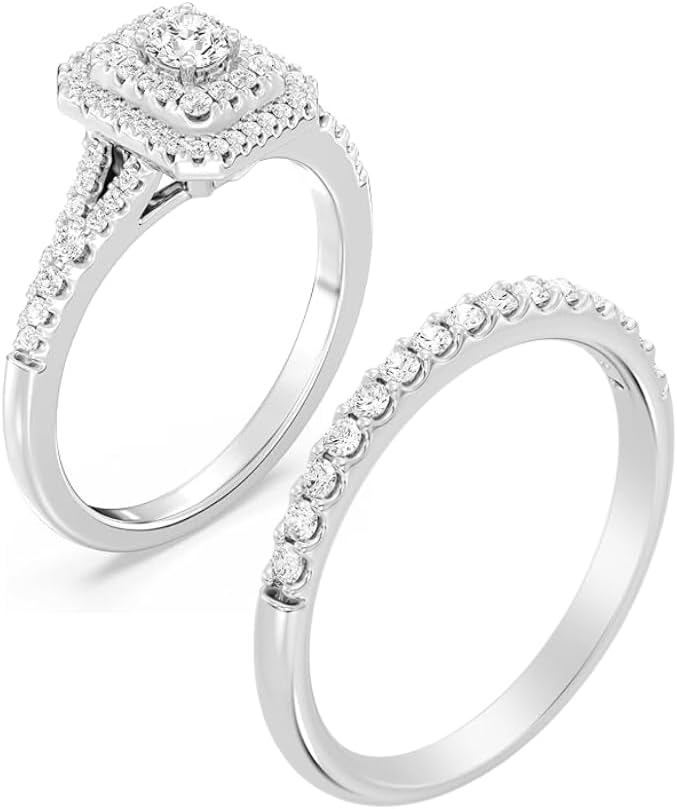 This stunning engagement and wedding ring set is the perfect symbol of your love. The set features a 1/2ctw square shaped engagement ring paired with a 1/4ctw lab grown diamond wedding band, both beautifully crafted in sterling silver. The engagement ring showcases brilliant round stones, surrounded by smaller accent diamonds that add extra sparkle and elegance. The matching wedding band, set with lab grown diamonds, complements the engagement ring flawlessly, offering a harmonious and timeless look. Both rings are designed with attention to detail and ethical craftsmanship, making this set an exquisite choice for your special day.