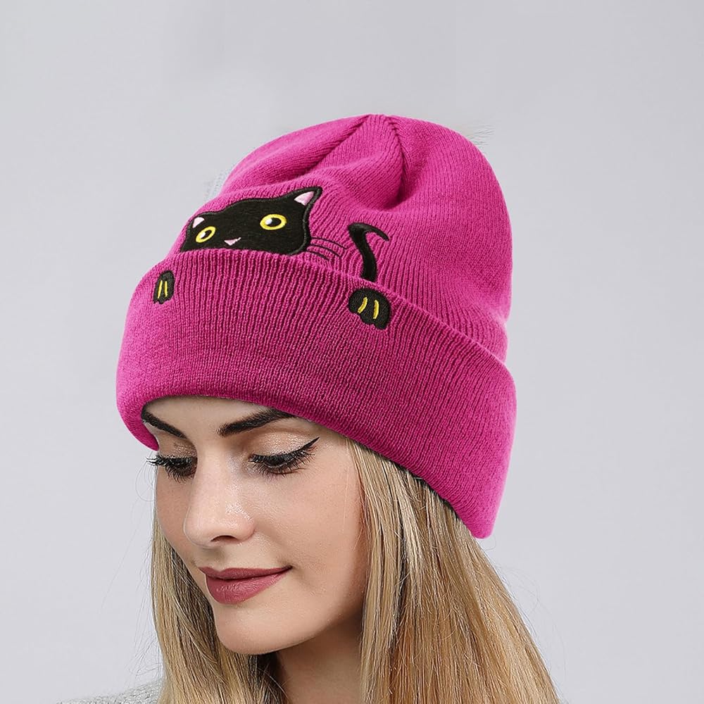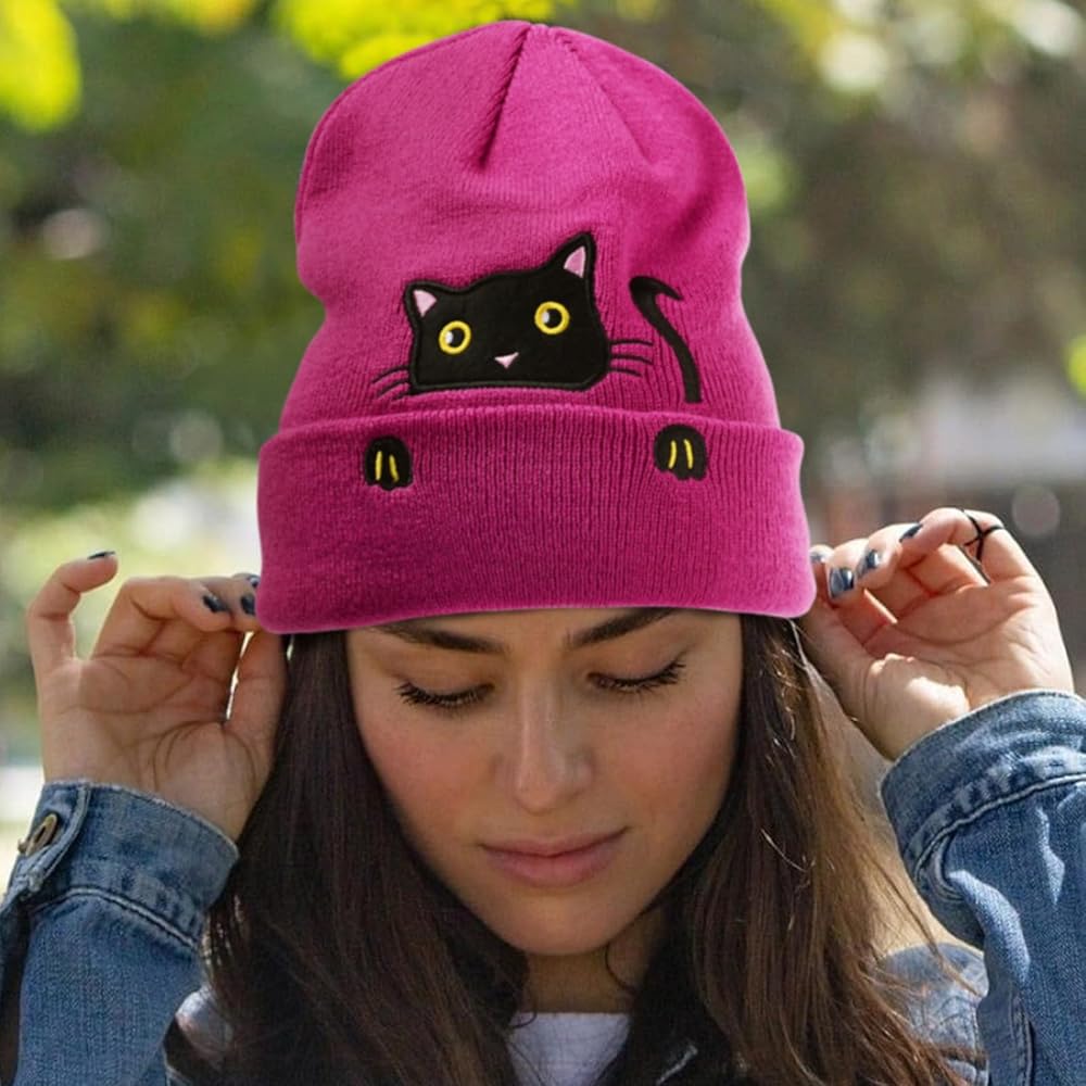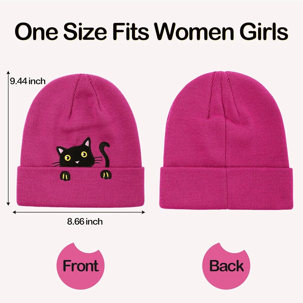 Embroidered black cat winter warm beanie hats: black, purple, hot pink.