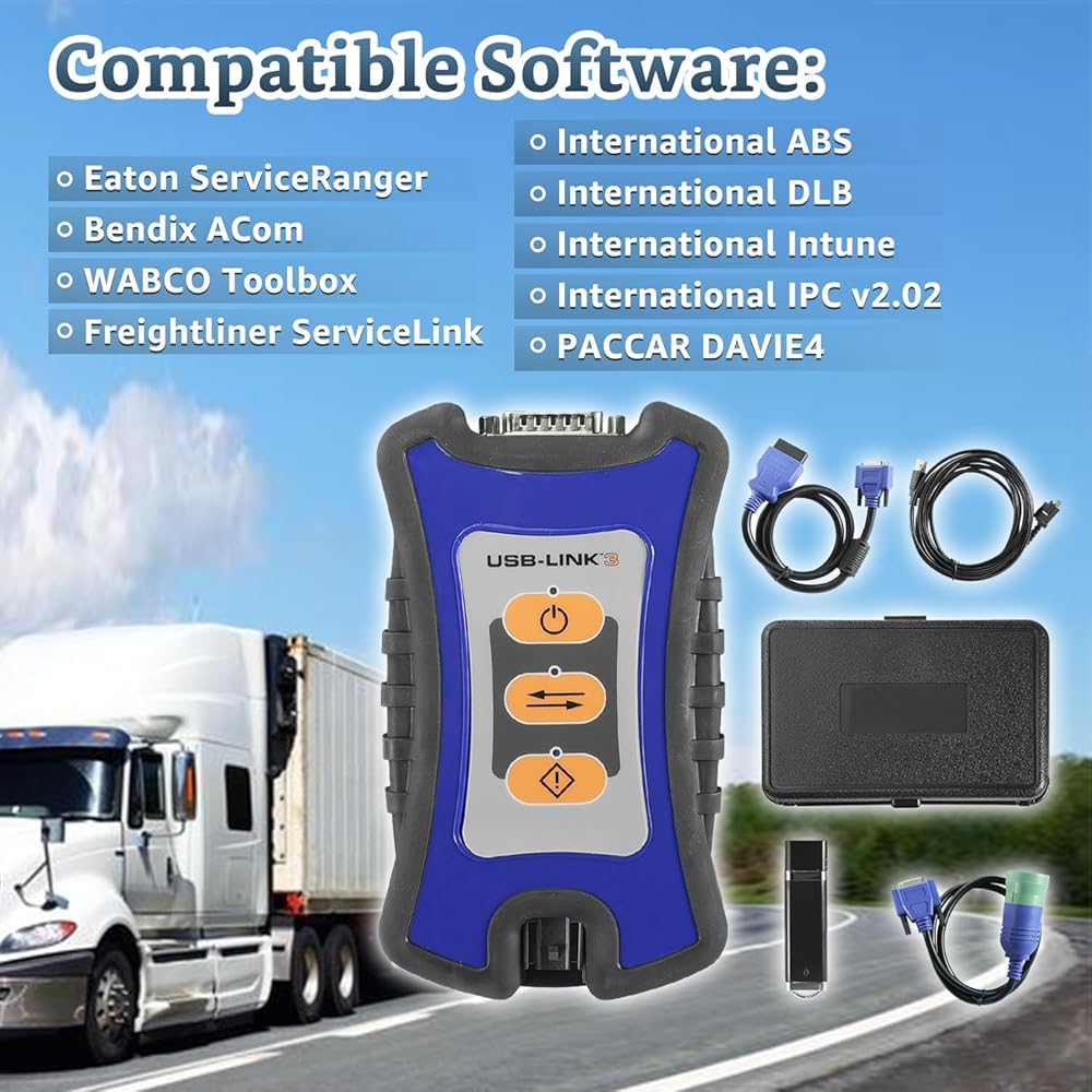 • Compatible Software (Not Included): Bendix ACom, WABCO Toolbox, Freightliner ServiceLink, International ABS, DLB, Intune, IPC v2.02, PACCAR DAVIE4, Detroit Diesel Diagnostic Link, CAT Electronic Technician (On-Highway only), Cummins Insite, International ServiceMAXX Fleet Pro, Hino eXplorer, PTT, VCAD Elite Mack, V-MAC Service Tools, Allison DOC For PC-Service Tool