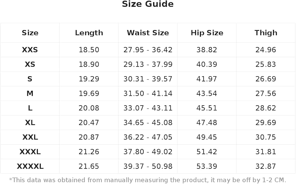 XXXL:Hip Size:51.4IN,Length:21.3IN,Thigh:31.8IN,Waist Size:37.8-49.0IN