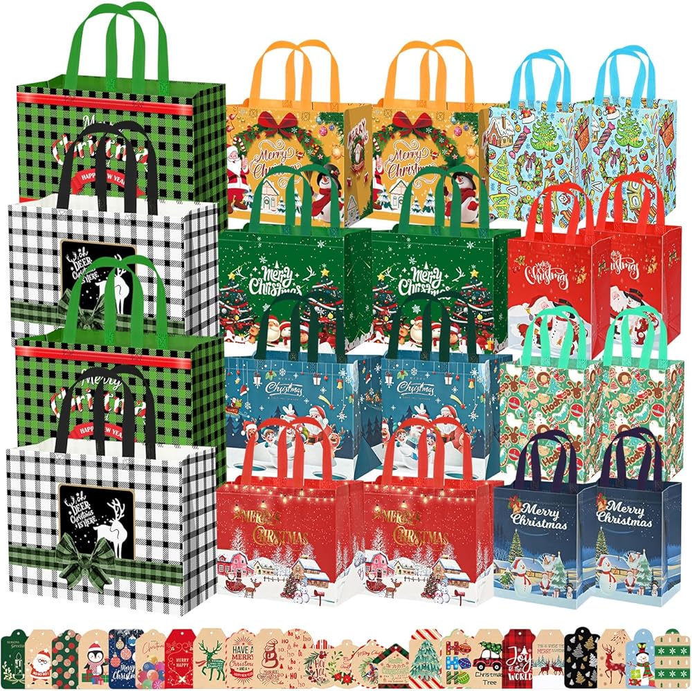 Featuring 20 non-woven Christmas gift bags and 24 Christmas-themed gift tags, this set offers a variety of options to suit your needs. Each Christmas bag is decorated with charming holiday patterns instantly bringing festive cheer to your gift presentation. These Christmas bags add a joyful touch to every occasion, making gift-giving even more special.
