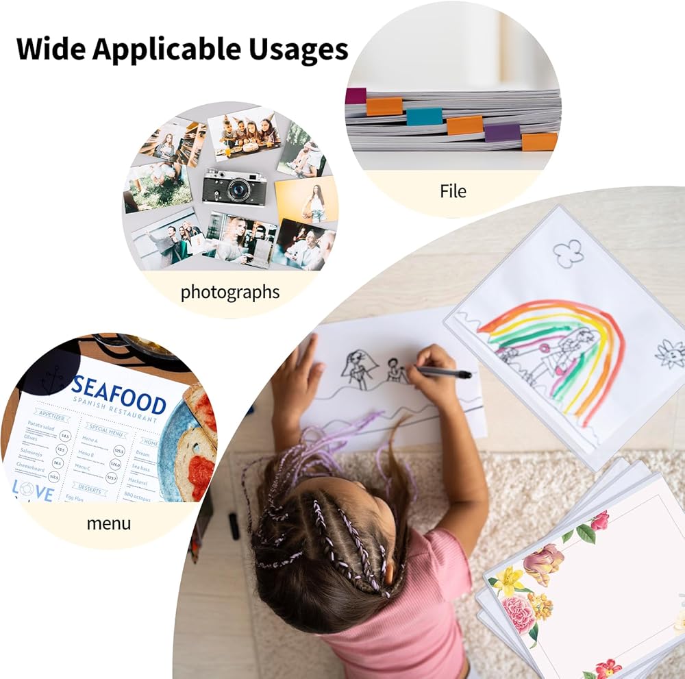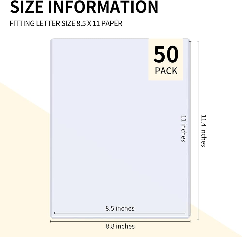 [Package And Size]:Come with 50 pieces photo sleeves 8.5x11,External dimension: 8.89× 11.22 inches,top loaded photo protectors internal dimensions approx 8.5x11 inches, fits letter size 8.5 ×11 paper, prints,menu, photos or other files.It large size and enough quantity to meet your daily use and replacement needs