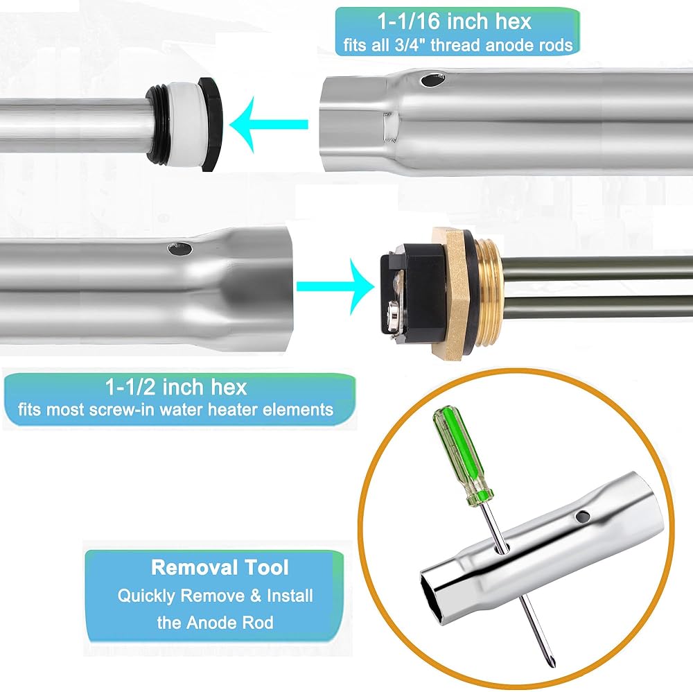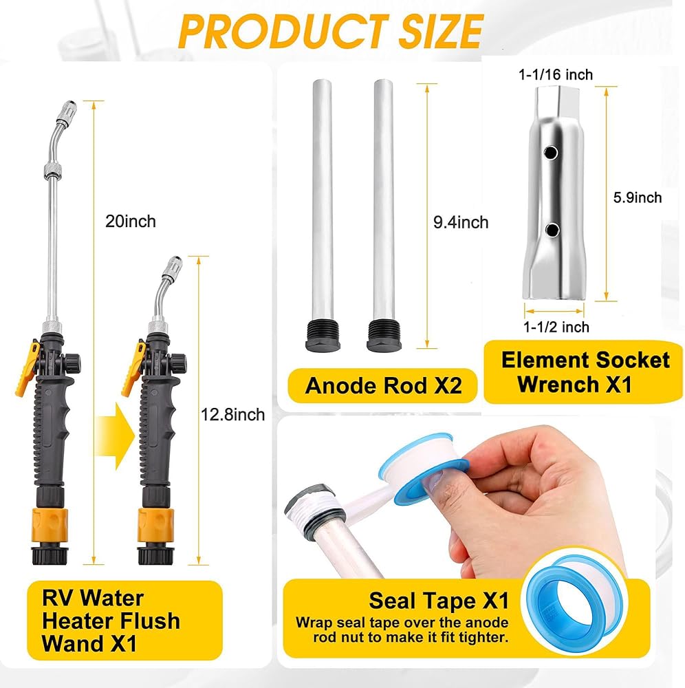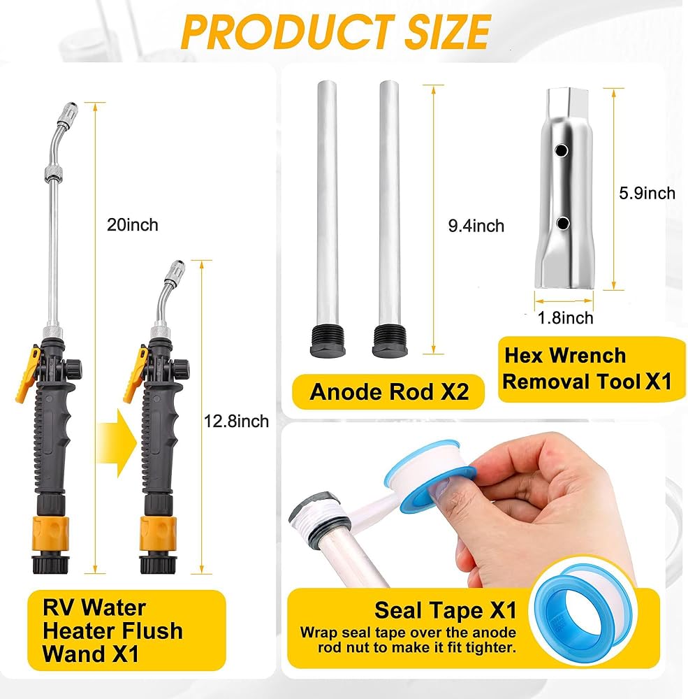 • 【استخدام واسع】: يمكن لشطف خزان سخان المياه RV إزالة الميزان وقطعة الأنود داخل سخان المياه بسرعة أكثر فعالية. يستخدم قضيب الأنود لسخان المياه RV التحليل الكهربائي لجذب جميع الملوثات الموجودة في الماء إلى نفسه لمنع تآكل خزان RV وتراكم المعادن، ويزيل مشاكل رائحة سخان المياه، ويطيل عمر عربة سكن متنقلة، والتخييم، والمنزل المحمول، وسخان مياه السيارة.